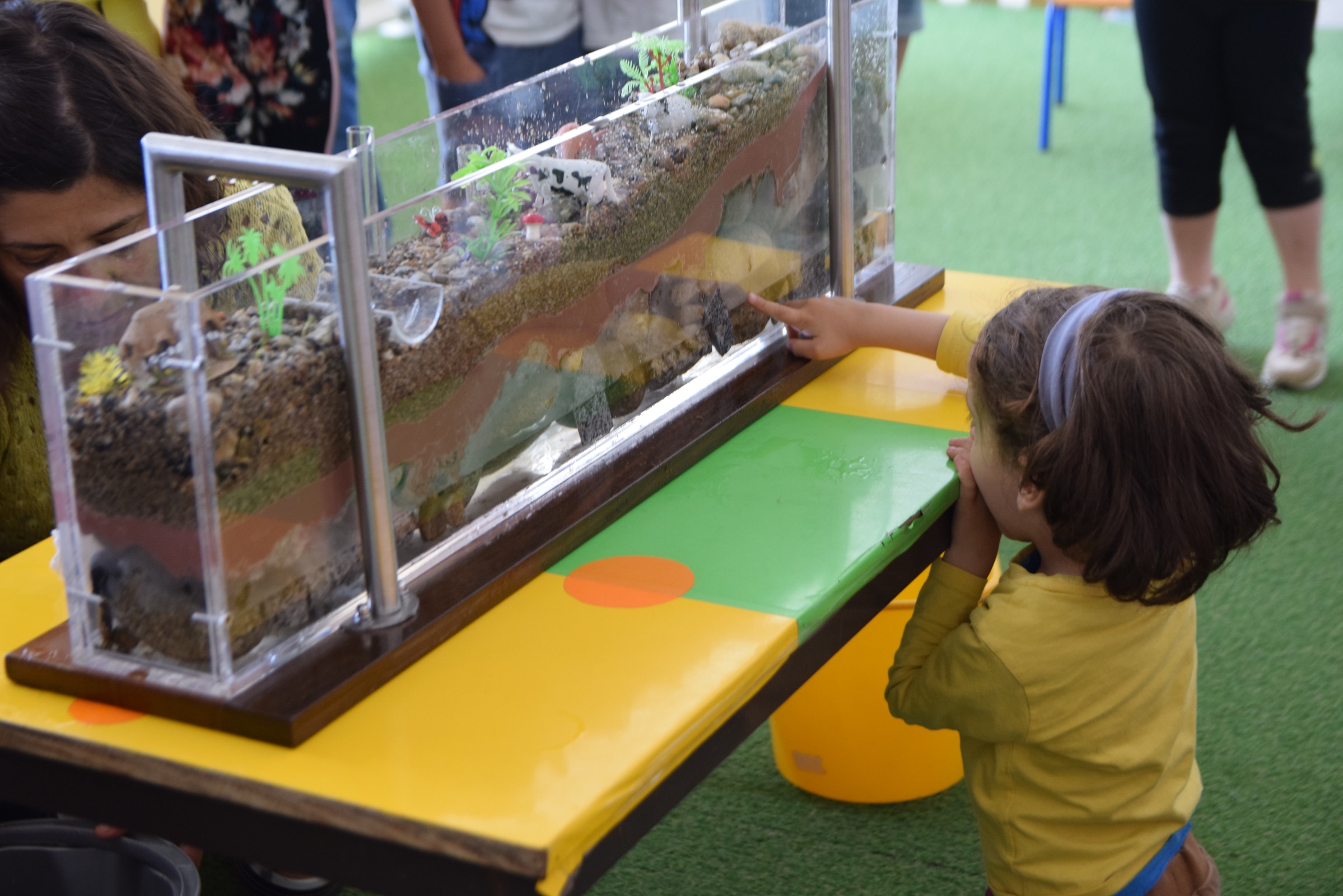 Com o recurso a um aquífero, onde estão representadas as várias camadas abaixo do solo visível, os mais novos observam como uma água tingida, representando a poluição, se espalha rapidamente por todas as áreas do aquífero, sendo depois necessária grandes quantidades de água limpa para a terra voltar ao seu estado inicial. Desta forma prática, as crianças apreendem que a contaminação das águas, mesmo num nível baixo, produz sempre efeitos nefastos e prolongados - e às vezes irreversíveis - que afetam plantas, animais e humanos.