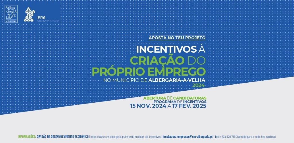 área de conteúdos (não partilhada)O Município de Albergaria-a-Velha tem aberto, até 17 de fevereiro de 2025, o período de candidaturas ao Programa de Incentivos à Criação do Próprio Emprego. Pelo décimo ano consecutivo, a Câmara Municipal vai apoiar a criação e fixação de novos negócios no Concelho, através da atribuição de incentivos financeiros e apoio técnico.