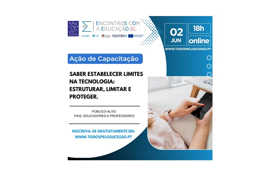 área de conteúdos (não partilhada)O Município de Albergaria-a-Velha dinamiza no dia 2 de junho, pelas 18h00, a ação de capacitação online “Saber estabelecer limites na tecnologia: Estruturar, Limitar, Proteger” dirigida a pais, educadores e docentes. A oficina integra o programa municipal de promoção do sucesso escolar “Encontros com a Educação – Todos pelo Sucesso” e é de participação gratuita, mediante inscrição prévia.