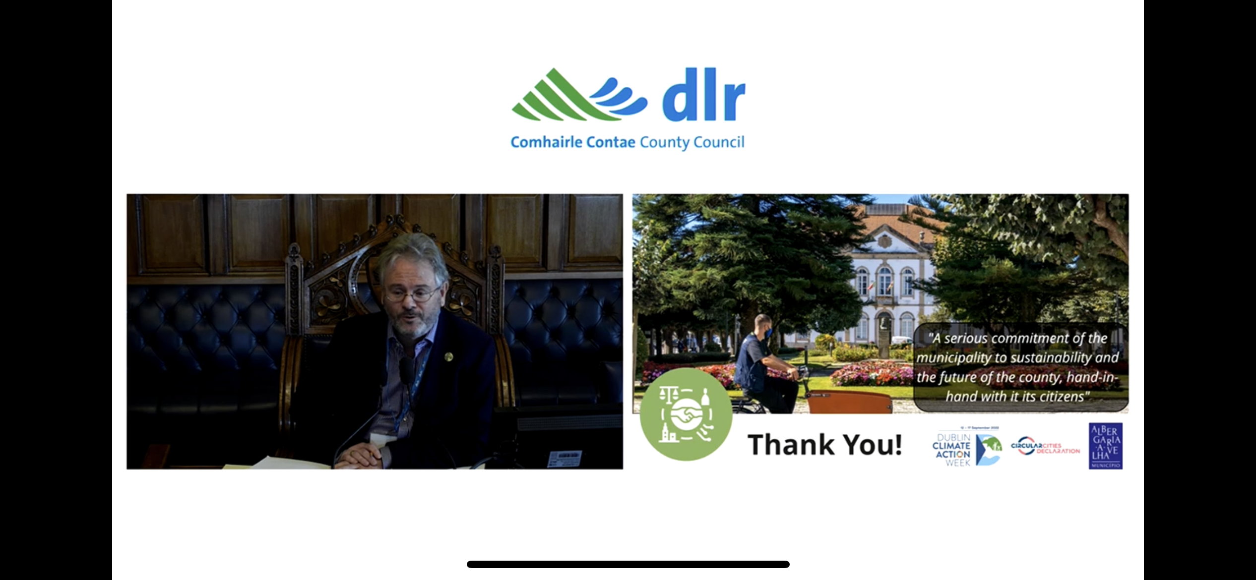 área de conteúdos (não partilhada)No dia 13 de Setembro, o Município teve a oportunidade de participar no Webinar ”Circular Economy Transition: The Role of Cities and Local Government”, inserido na Semana da Ação Climática de Dublin 2022, a convite do Município Dún Laoghaire, representando Portugal ao lado de cidades como Praga e Copenhaga.
