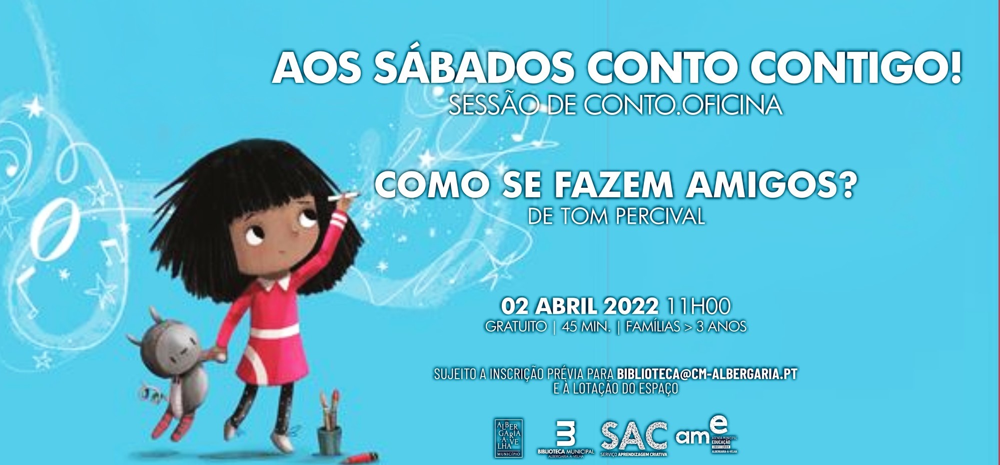 Programa de promoção da leitura da Biblioteca Municipal, integrado na Agenda Municipal de Educação, que pretende envolver as crianças e Famílias num espaço de sonho e de partilha, onde o Livro é o fio condutor. Enquanto atividade SAC – Serviço de Aprendizagem Criativa, cada sessão inclui a leitura encenada de uma obra, que é enriquecida com surpresas de criatividade artística relacionadas com a história. Como se fazem amigos, de Tom Percival é o conto de partida e chegada nesta sessão de Aos Sábados Conto Contigo!