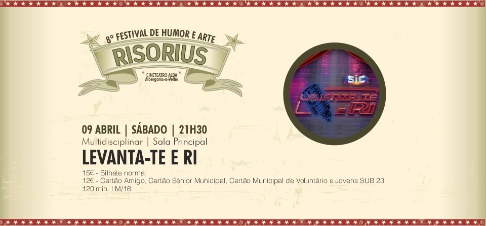 Levanta-te e Ri é um programa de televisão ao vivo de stand-up comedy, produzido e transmitido originalmente pela SIC. Ao longo das suas muitas emissões, deu-nos a conhecer artistas que são hoje grandes nomes no Humor. Apresentado por Fernando Rocha, o programa no Cineteatro Alba terá a participação de vários comediantes portugueses, prontos a desencadear momentos hilariantes.