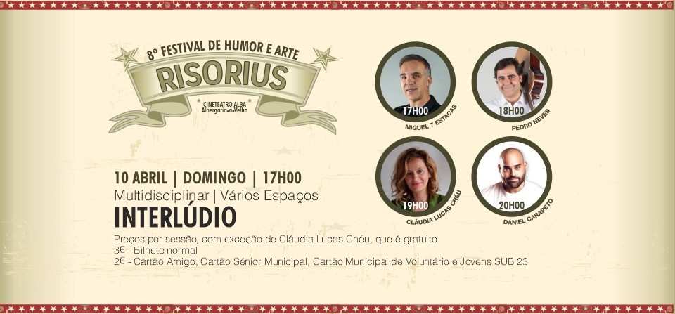Interlúdio é um conceito. Como se um lapso de tempo irrompesse por entre o festival e fosse um intervalo de tudo o que já aconteceu no Risorius, permitindo ao espectador dar outra vida a espaços do teatro. Entre a Sala Alba, o Espaço Café-Concerto ou a Sala Estúdio, teremos momentos distintos, como solos de humor, música ou a apresentação de livros. Cláudia Lucas Chéu, Daniel Carapeto, Miguel 7 Estacas e Pedro Neves serão os responsáveis por tornar o final de tarde num momento diferente.