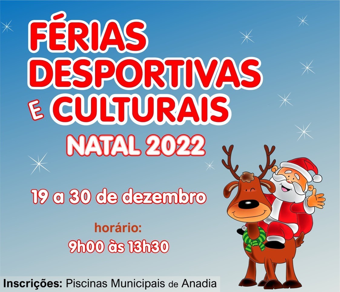 As Férias Desportivas e Culturais de Natal vão ser desenvolvidas, entre as 9h00 e as 13h30, em vários espaços municipais, nomeadamente Complexo Desportivo de Anadia, Biblioteca Municipal, Museu do Vinho Bairrada, Ecoparque de Anadia e Parque Urbano de Anadia. As várias ações abrangem as áreas do ambiente, da cultura, do desporto, da expressão artística e ainda outros domínios de relevante interesse para as crianças.