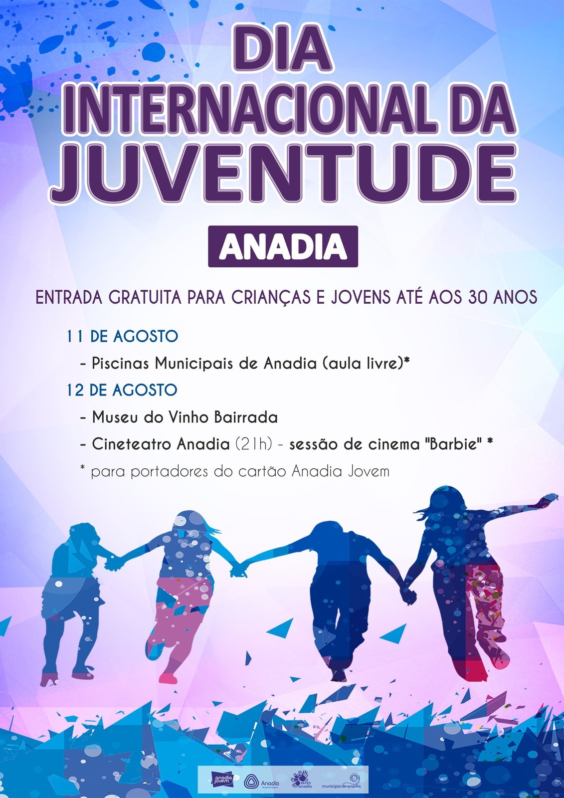No dia 12 de agosto (sábado), crianças e jovens até aos 30 anos poderão usufruir, sem custos, dos serviços disponibilizados pelo Museu do Vinho Bairrada e pelo Cineteatro Anadia, que exibirá, neste dia, a partir das 21h00, o filme “Barbie”. Portadores do cartão Anadia Jovem terão entrada gratuita nas Piscinas Municipais de Anadia no dia 11 de agosto (sexta-feira), dado que este equipamento se encontra encerrado ao público ao sábado.