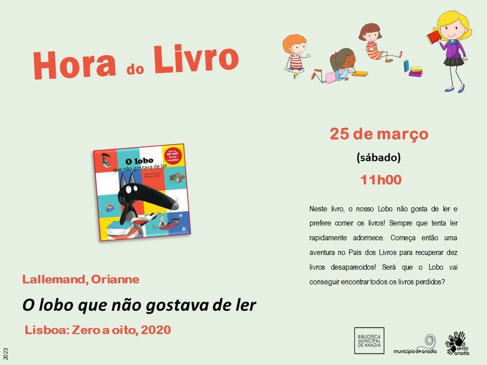 A “Hora do Livro”, iniciativa da Biblioteca Municipal de Anadia para os leitores mais jovens, apresenta-nos o livro "O lobo que não gostava de ler". “Neste livro, o nosso Lobo não gosta de ler e prefere comer os livros! Sempre que tenta ler rapidamente adormece. Começa então uma aventura no País dos Livros para recuperar dez livros desaparecidos! Será que o Lobo vai conseguir encontrar todos os livros perdidos?".