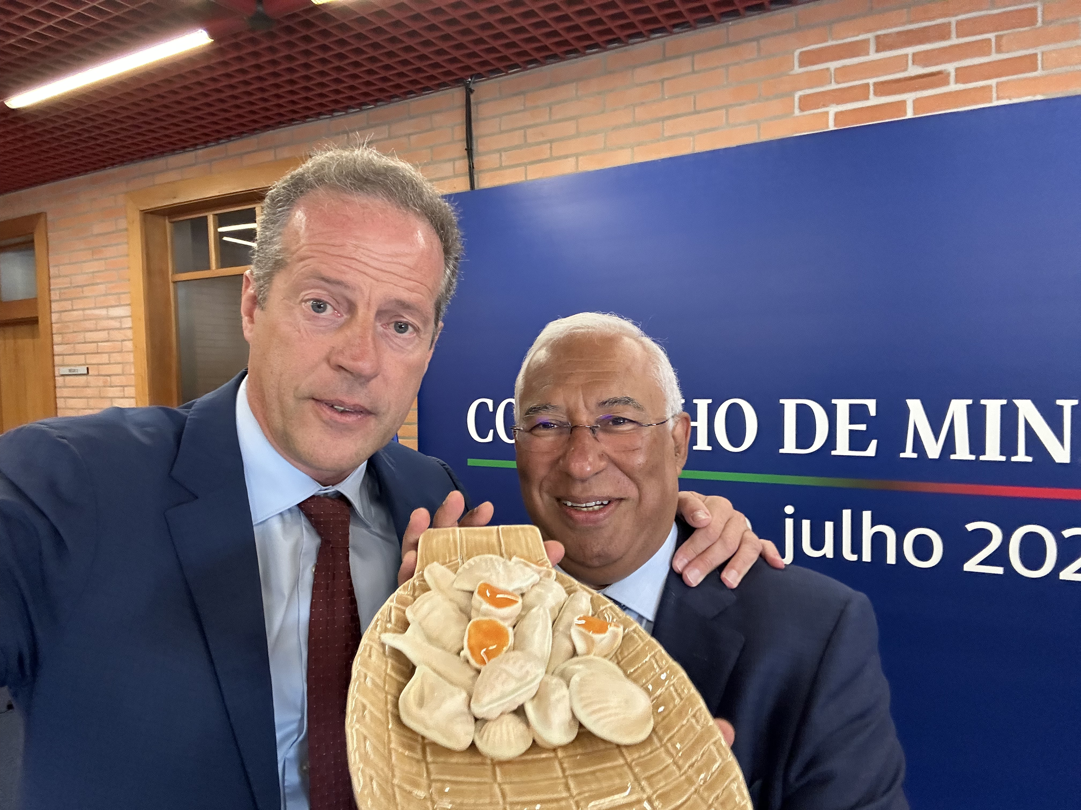 Além da oferta do livro “Aveiro Cidade dos Canais” com a dedicatória “Que Aveiro inspire e fortaleça quem Governa Portugal, para que o faça sempre pelos Canais de Bem Servir os Portugueses”, ofereci ao Primeiro-Ministro uma peça Bordalo Pinheiro, da responsabilidade da Confraria dos Ovos Moles de Aveiro, a canastra de Ovos Moles de Aveiro.