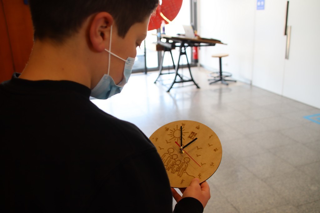 A segunda atividade, “Relógio a laser”, consistiu na criação de um relógio de parede com recurso à tecnologia CNC que permite a gravação e corte a laser de vários materiais. Os participantes desenharam o mostrador de cada relógio numa folha de papel que, após conversão, foi transferida e gravada a laser numa placa de contraplacado. Seguiu-se a aplicação do mecanismo do relógio, pronto a ser acertado.