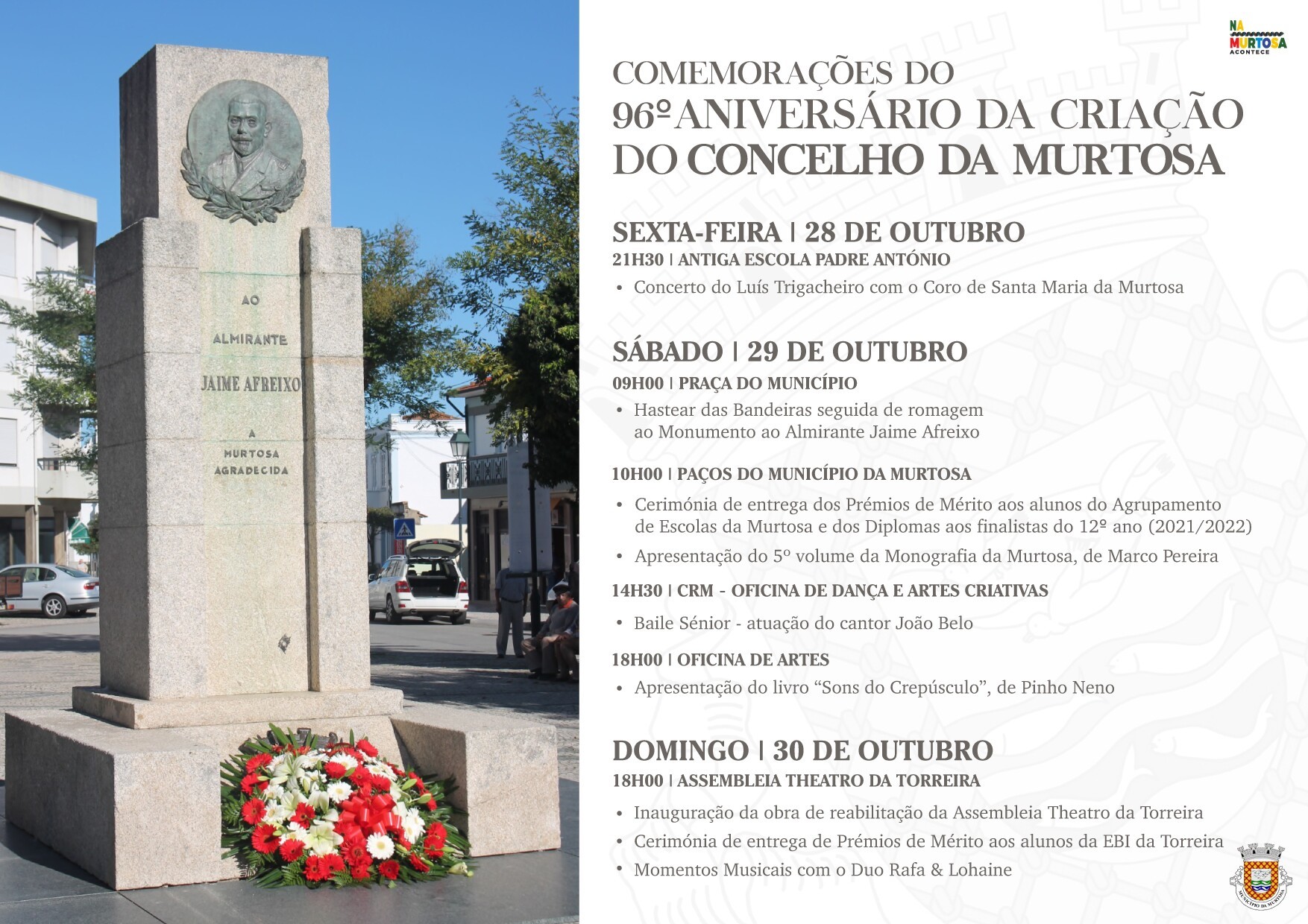 área de conteúdos (não partilhada)O Concelho da Murtosa celebra, no próximo dia 29 de outubro, o 96º aniversário da sua criação, pelo decreto emancipador do, então, Ministro do Interior, Almirante Jaime Afreixo.