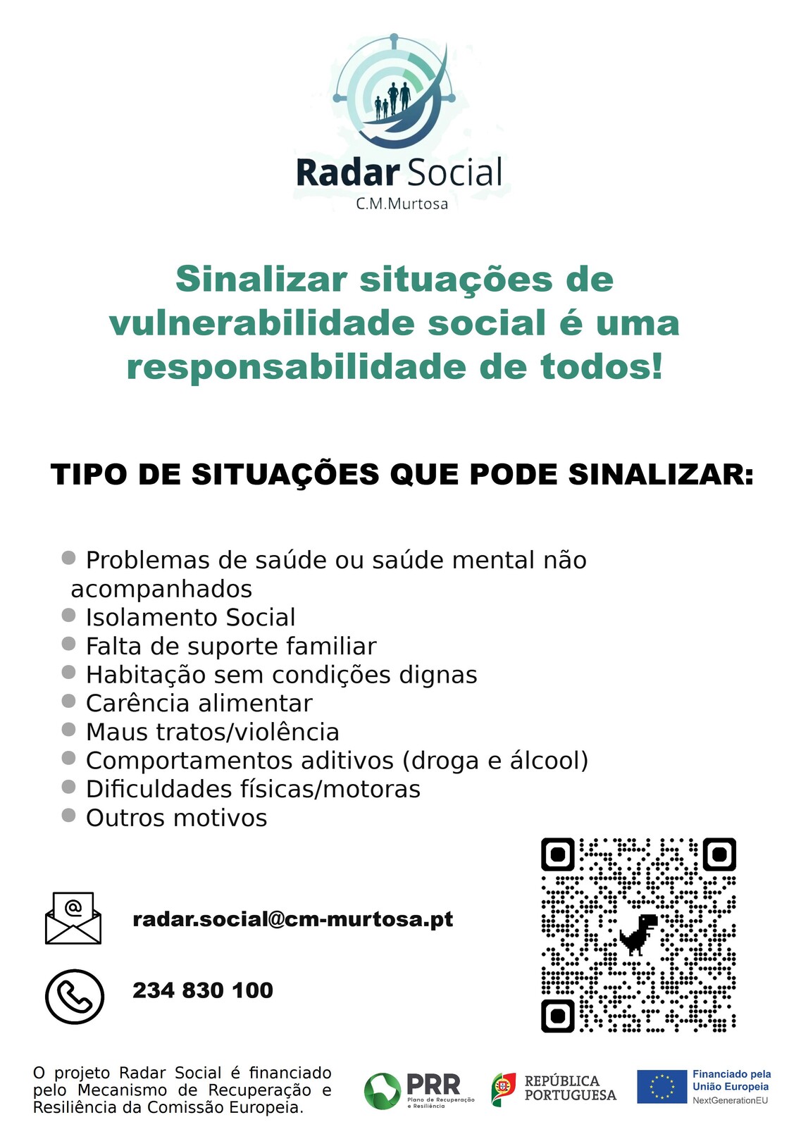 Está disponível nos horários normais de funcionamento, pessoalmente na sua sede, ou através das vias alternativas de contacto: telefónico (934 530 097), email (radar.social@cm-murtosa.pt), ou formulário online (ver código QR nos cartazes).