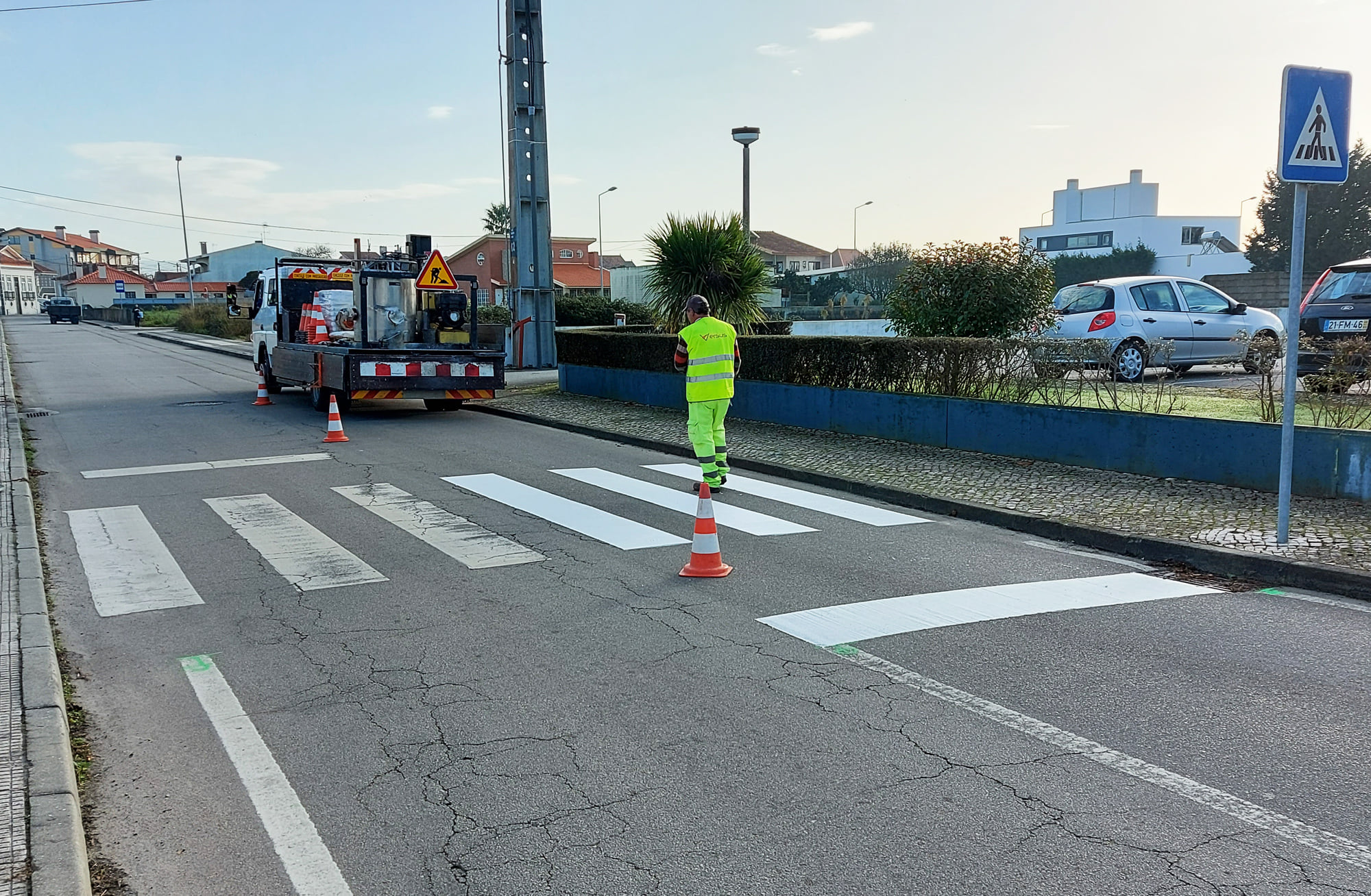 A intervenção contempla a marcação de linhas de berma, do eixo do arruamento, das linhas de paragem do tipo “STOP” e a demarcação das travessias (passadeiras) para peões.