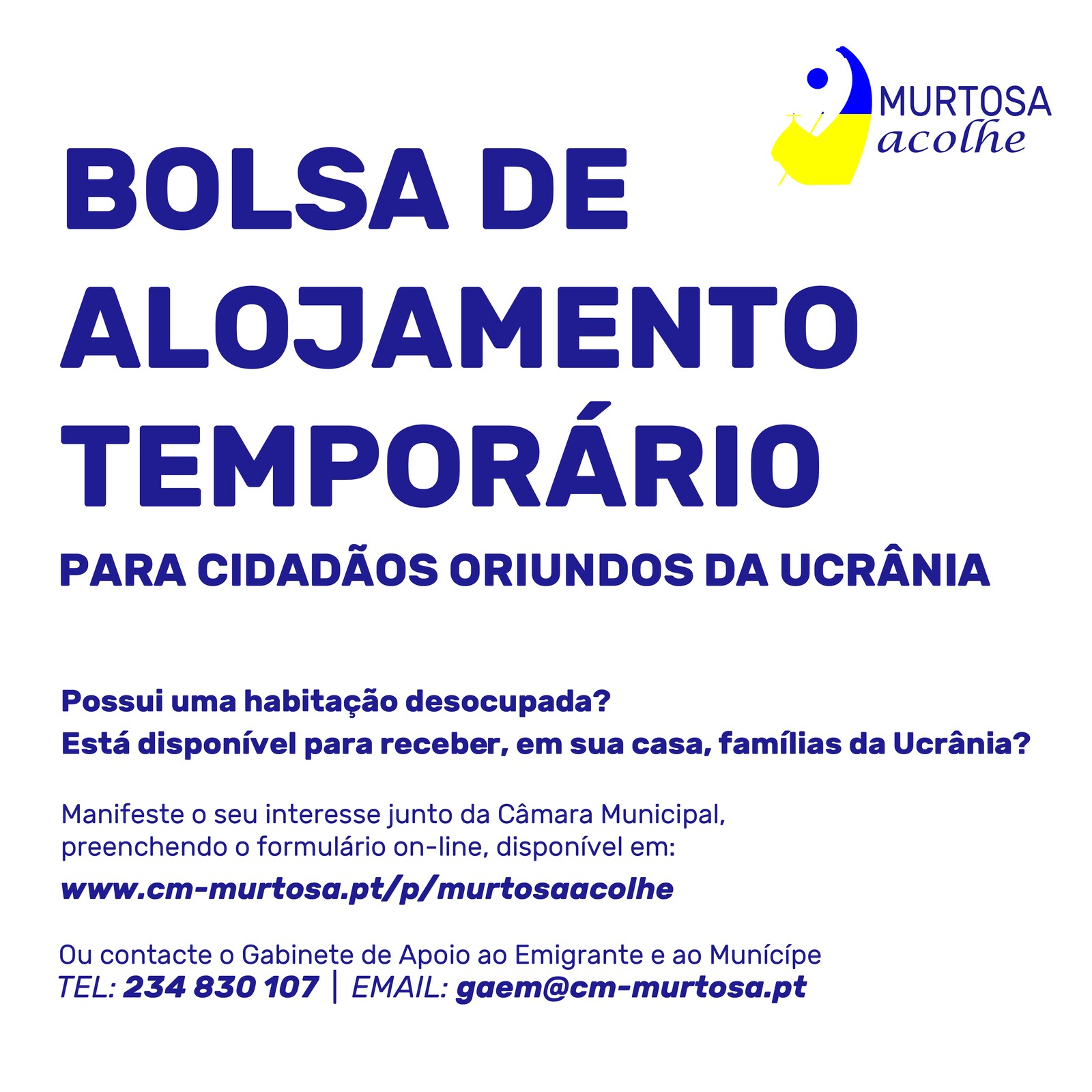 área de conteúdos (não partilhada)Tendo em consideração as manifestações de disponibilidade que têm chegado à autarquia, o Município da Murtosa decidiu criar uma bolsa de alojamento de emergência para acolhimento de refugiados da Ucrânia no concelho, onde se podem inscrever todos aqueles que desejem acolher, em suas casas, famílias ucranianas que fugiram do país devido à guerra.