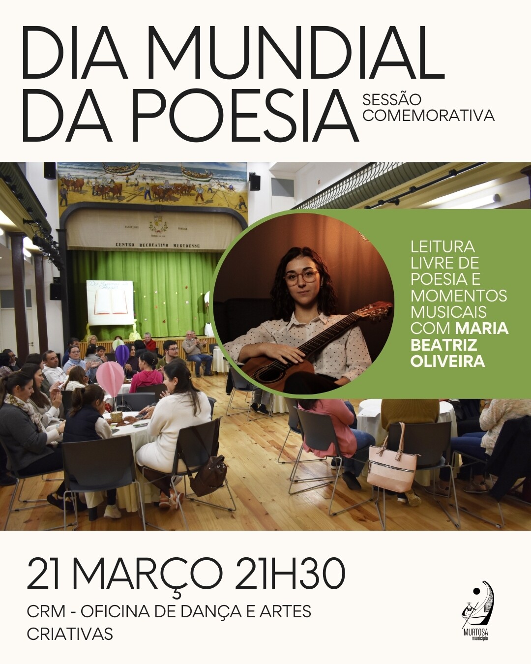 área de conteúdos (não partilhada)A Murtosa celebra o Dia Mundial da Poesia com uma sessão cultural, que terá lugar no CRM – Oficina de Dança e Artes Criativas, em Pardelhas, no próxima sexta-feira, dia 21 de março, pelas 21H30.
