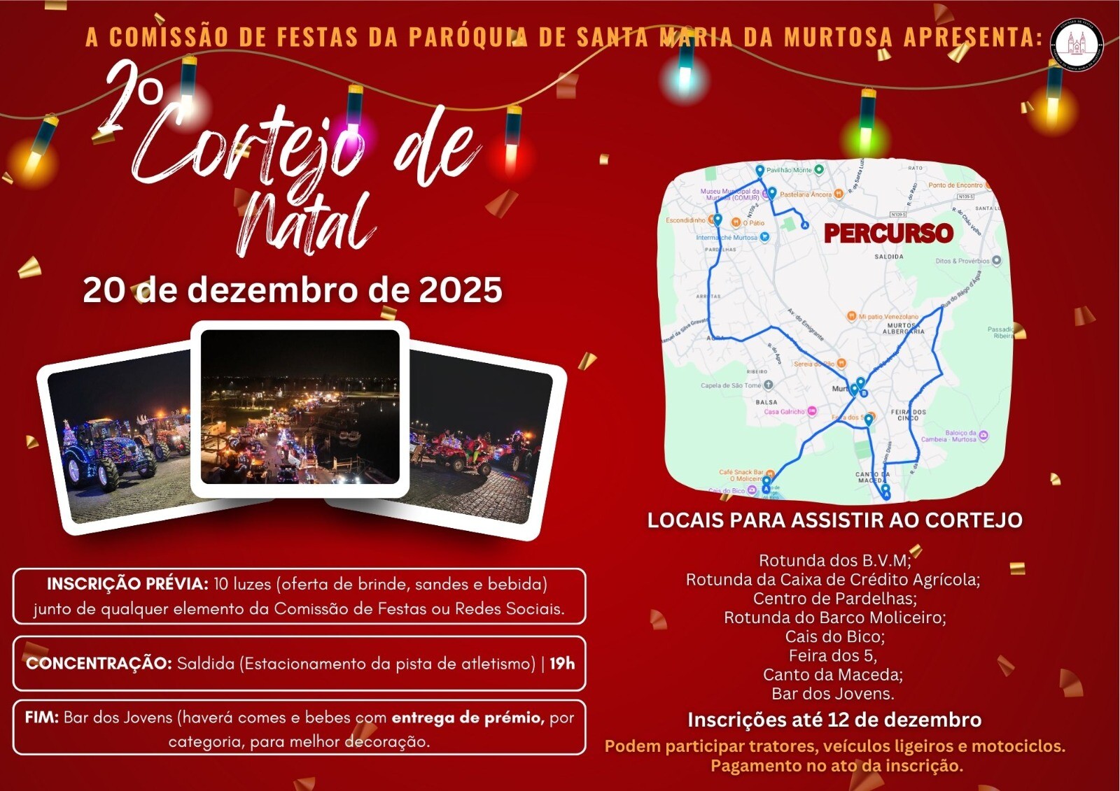 A Comissão de Festas da Paróquia de Santa Maria da Murtosa promove, no próximo dia 20 de dezembro, o seu 2.º Cortejo de Natal, uma iniciativa que pretende dinamizar a comunidade e celebrar o espírito natalício com um desfile iluminado pelas ruas da freguesia.