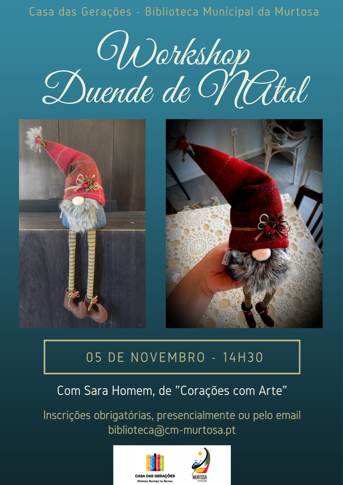 A Casa das Gerações-Biblioteca da Murtosa recebe no próximo dia 5 de novembro, pelas 14:30h, um workshop "Duende de Natal", dinamizado pela Sara Homem "Corações com Arte".