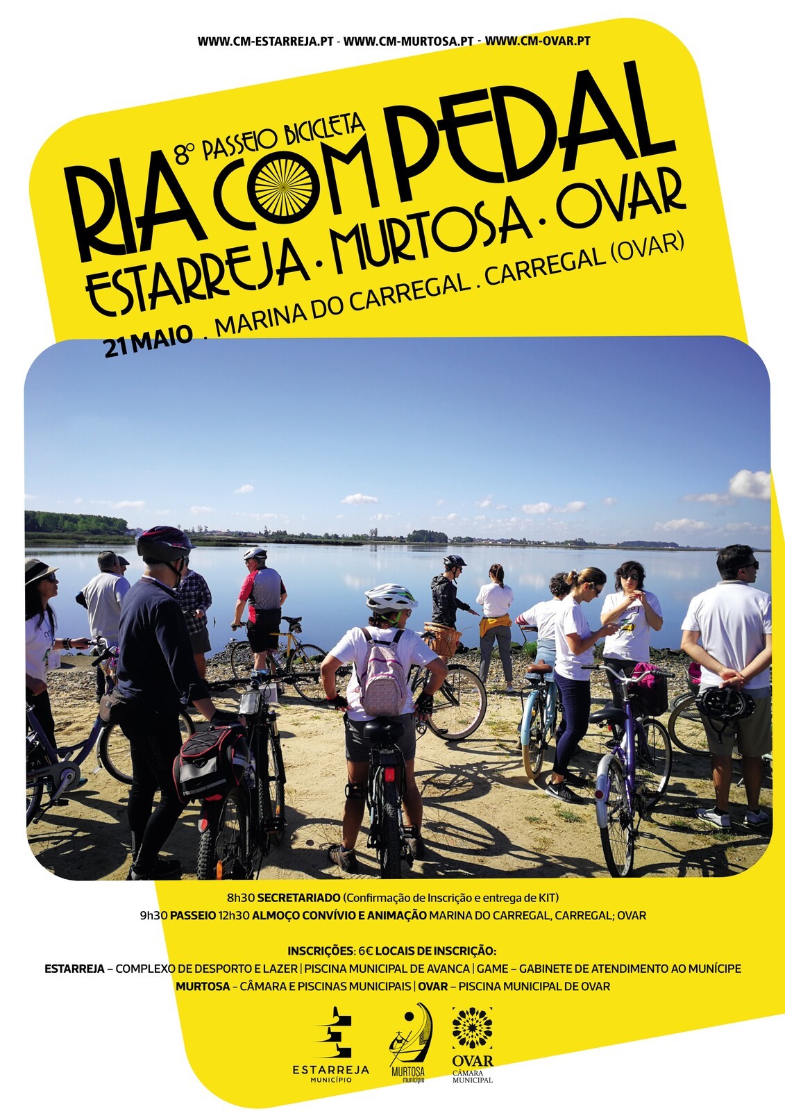 No próximo dia 21 de maio, terá lugar a 8º edição da “Ria com Pedal”, um grande passeio de bicicleta que une os Municípios de Ovar, Murtosa e Estarreja, ao longo de 36km.