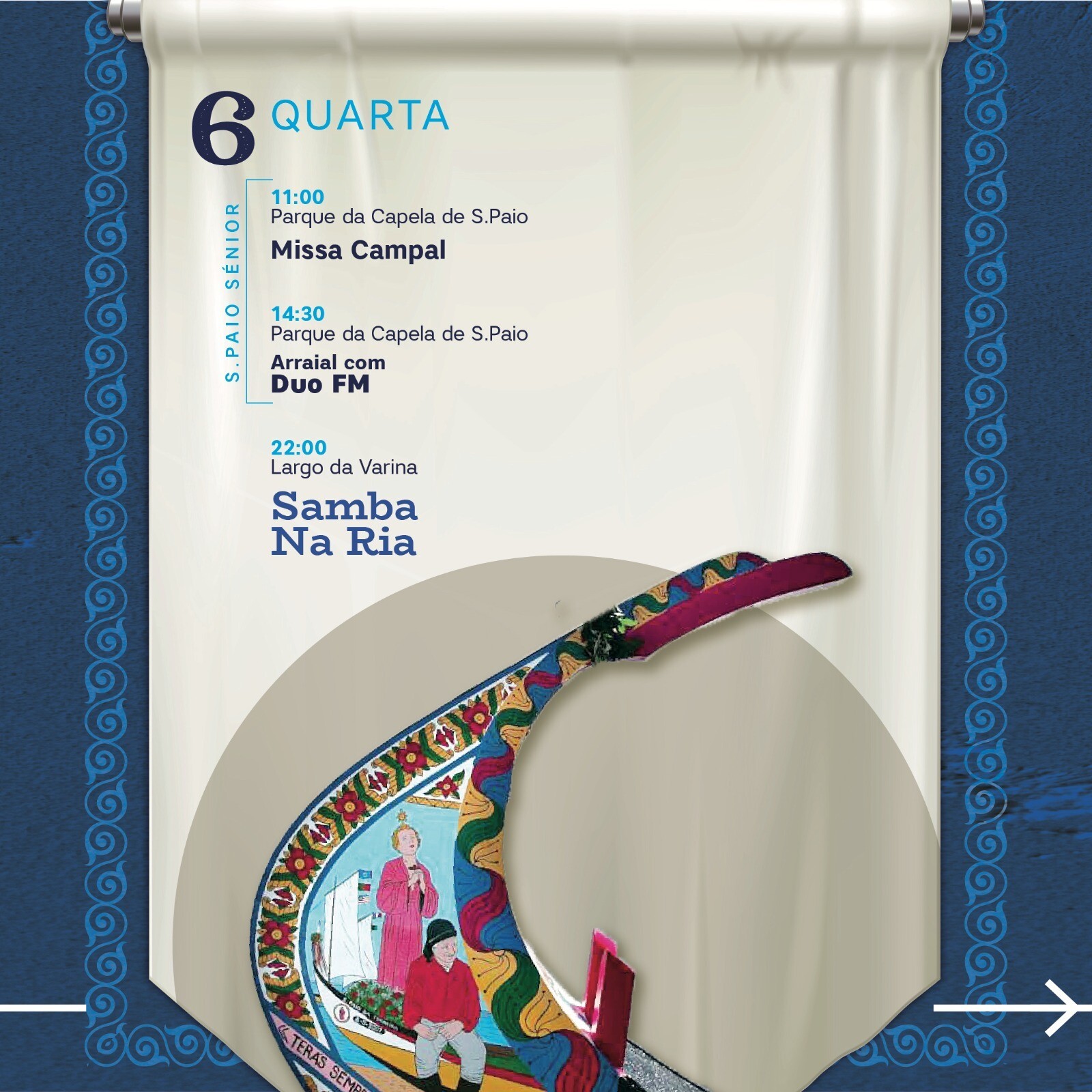 Integrado na programação da animação de Verão "Romaria de São Paio", o Largo da Varina, na Torreira, recebe, no dia 6 de Setembro, pelas 22H00, o concerto do grupo Samba na Ria.