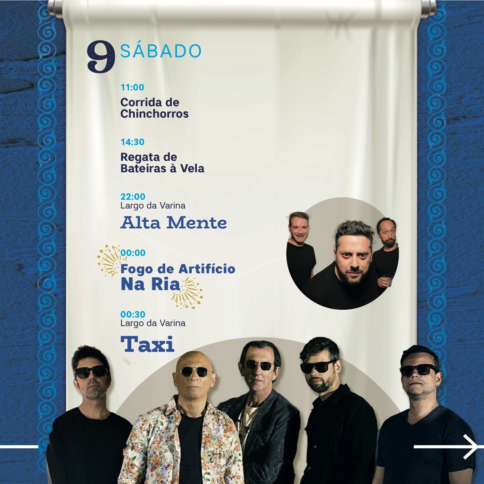 Integrado na programação da animação de Verão "Romaria de São Paio", o Largo da Varina, na Torreira, recebe, no dia 9 de Setembro, pelas 22H00, o concerto dos grupos TÁXI + Banda Alta Mente.