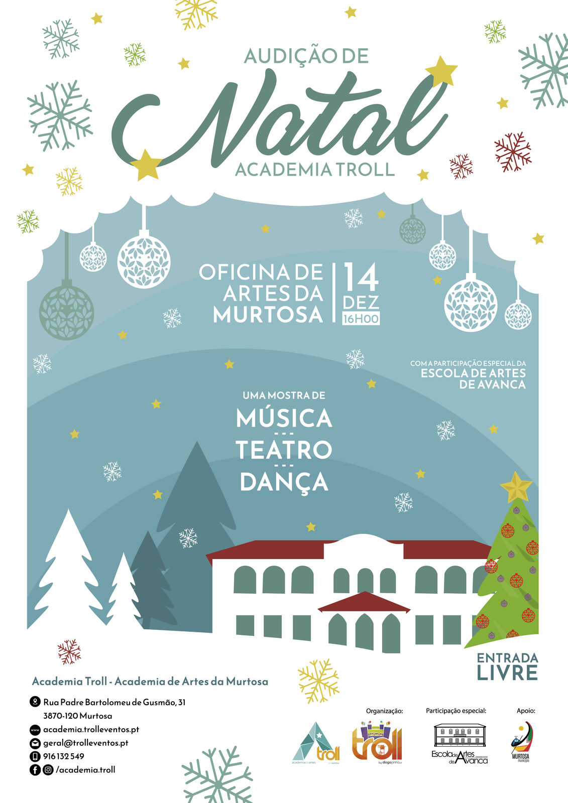 O auditório da Oficina de Artes recebe, no dia 14 de dezembro, pelas 16H00, a audição de natal da Academia Troll. A iniciativa tem por objectivo a divulgação do trabalho em desenvolvimento na academia, a promoção das artes em geral e o incentivo ao desenvolvimento cultural e artístico do público murtoseiro. Esta audição contará com uma mostra de teatro, dança e música, e com uma participação especial da Escola de Artes de Avanca, escola com cerca de 30 anos e parceira da Academia Troll. A entrada é gratuita e aberta a toda a comunidade.