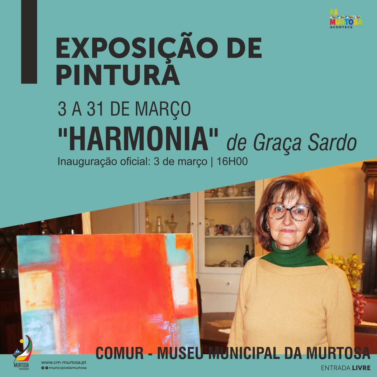 área de conteúdos (não partilhada)No próximo dia 3 de março, pelas 16H00, terá lugar, na COMUR-Museu Municipal da Murtosa, a inauguração da exposição “Harmonia”, que reúne trabalhos de pintura da artista plástica Murtoseira Graça Sardo.