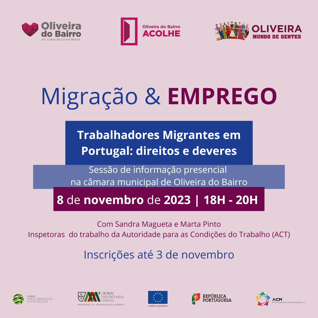 área de conteúdos (não partilhada)A Câmara Municipal de Oliveira do Bairro vai promover no próximo dia 8 de novembro, às 18h00, um workshop intitulado "Trabalhadores Migrantes em Portugal: direitos e deveres", destinado à população migrante, nacionais de países terceiros.