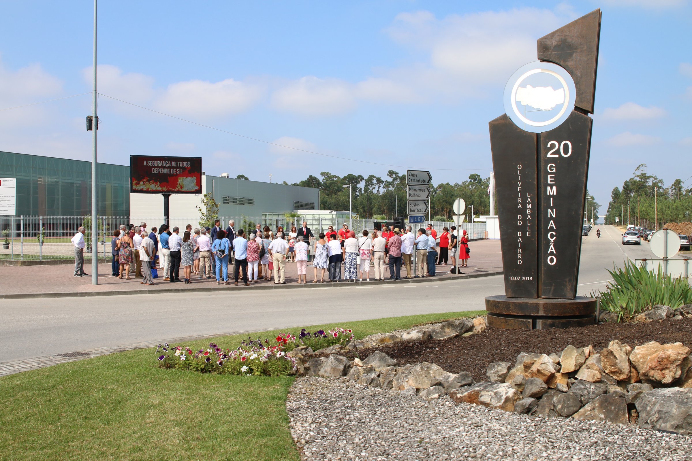 O monumento alusivo ao 20.º aniversário da Geminação entre Oliveira do Bairro e Lamballe, localizado na rotunda próxima do Espaço Inovação, apresenta 3,36m de altura e uma largura de 1,30. O conceito da peça nasce a partir de uma base circular que representa a fundação ou o alicerce da geminação, em que a parte inferior da conferência está dividida em duas metades que simbolizam as duas cidades. O elemento é constituído por duas peças iguais individualizadas, com "crescimento" ascendente, lado a lado na sua verticalidade, como simbologia da continuidade da geminação de cidades gémeas e do crescimento das relações a nível cultural, social, de afinidades e de interesses comuns entre as comunidades.