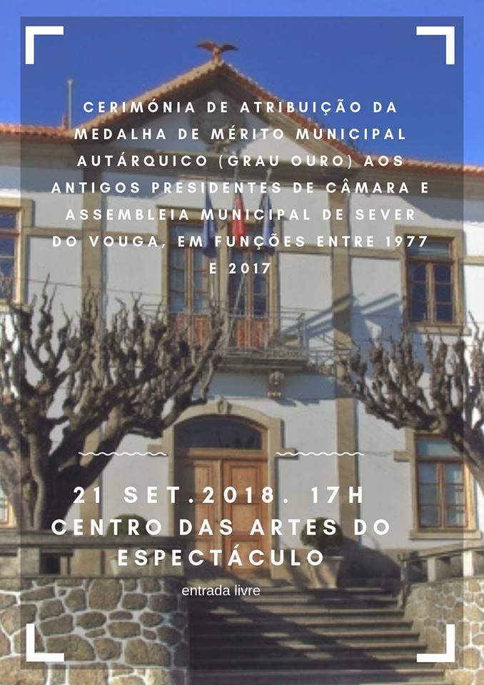 área de conteúdos (não partilhada)Os antigos presidentes de Câmara e Assembleia Municipal de Sever do Vouga, que exerceram funções entre 1977 e 2017, vão ser homenageados durante a cerimónia de atribuição da medalha de mérito municipal autárquico (grau ouro). A cerimónia decorre no dia 21 de setembro, dia do feriado municipal, pelas 17h00, no Centro das Artes e do Espetáculo de Sever do Vouga.