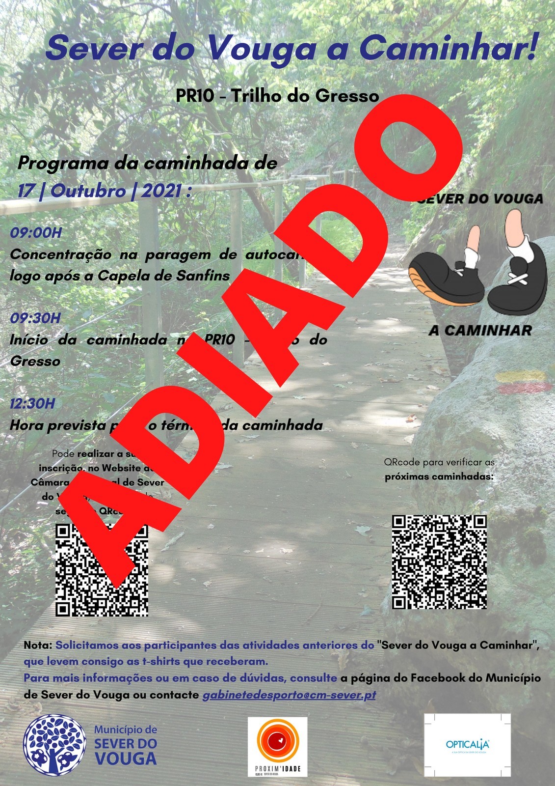 “Devido às condições climatéricas previstas para este domingo, dia 17 de Outubro, e também pelo mau estado em que se encontram algumas partes do terreno, a 6ª caminhada do “Sever do Vouga a caminhar” será adiada, passando para o próximo dia 24 de Outubro de 2021.
