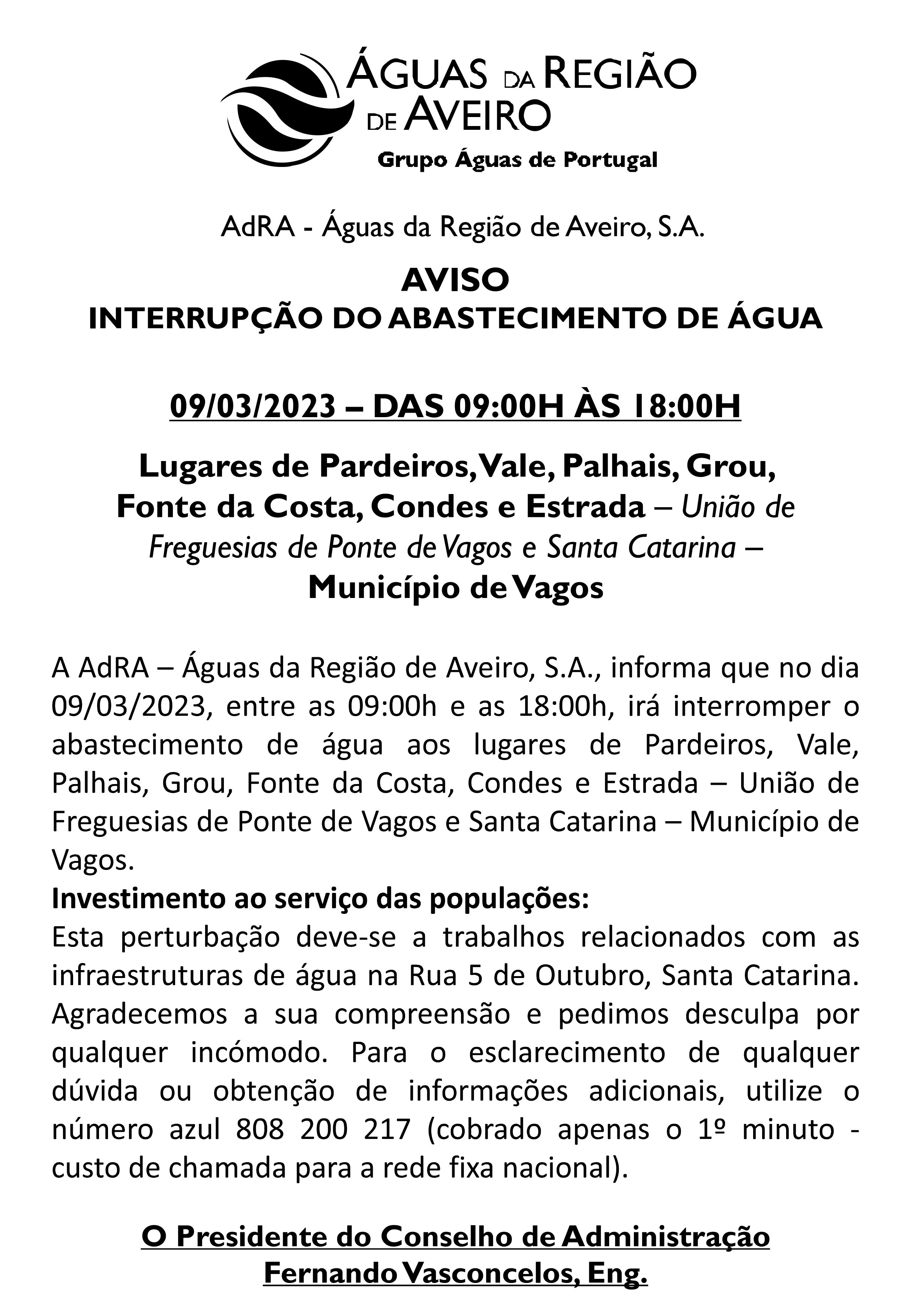 Informa-se que a AdRA – Águas da Região de Aveiro, S.A, devido a trabalhos relacionados com as infraestruturas de água na Rua 5 de Outubro, em Santa Catarina, irá interromper o fornecimento de água, no dia 9 de março de 2023, das 09h00 às 18h00, na União de freguesias de Ponte de Vagos e Santa Catarina, nos lugares de Pardeiros, Vale, Palhais, Grou, Fonte da Costa, Condes e Estrada.