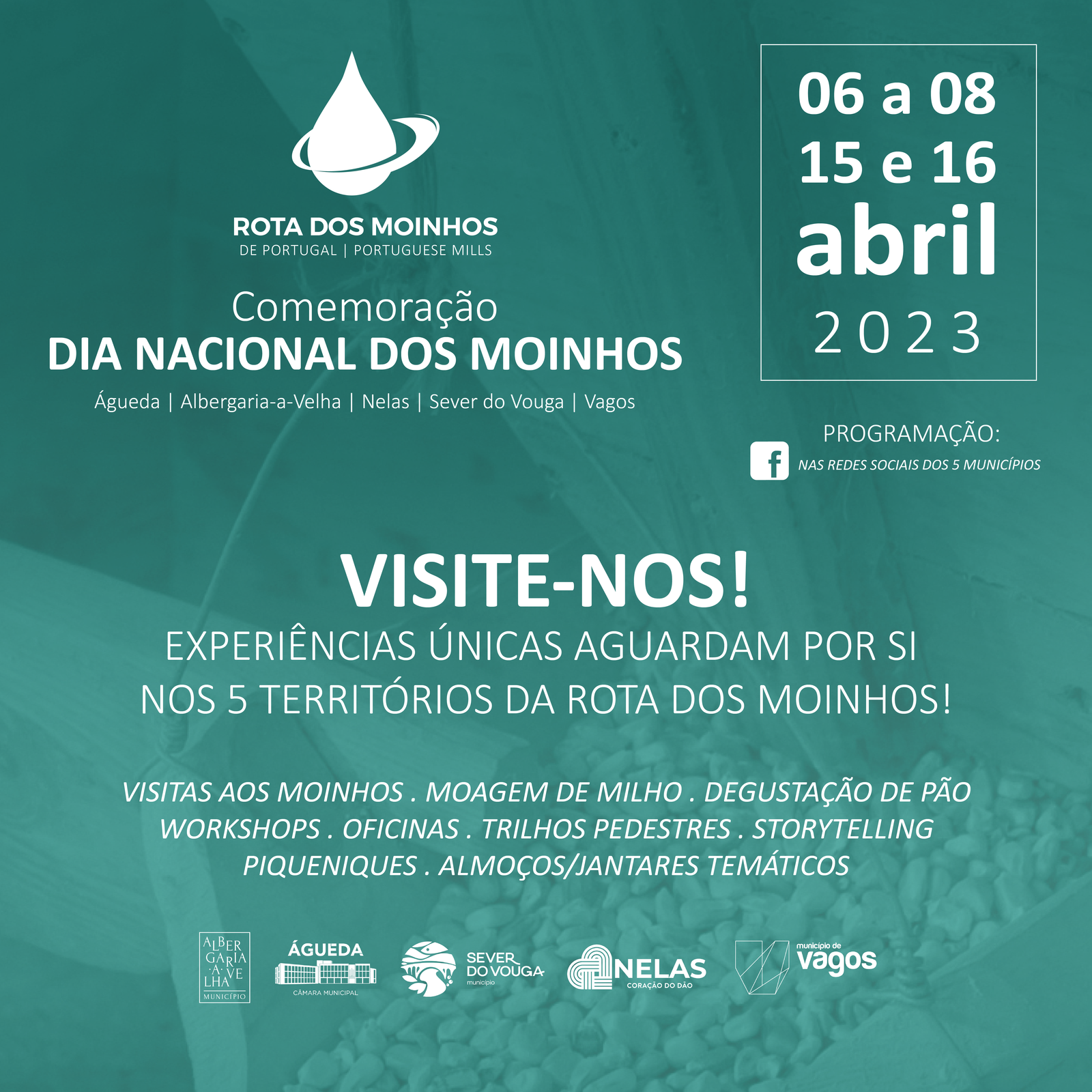 área de conteúdos (não partilhada)A Rota dos Moinhos de Portugal – Portuguese Mills, constituída pelos municípios de Águeda, Albergaria-a-Velha, Nelas, Sever do Vouga e Vagos e oficialmente constituída no passado dia 09 de janeiro, com a assinatura do protocolo intermunicipal, apresenta pelo terceiro ano consecutivo um programa conjunto e diversificado de atividades entre 6 e 16 de abril, no âmbito das comemorações do Dia Nacional dos Moinhos.