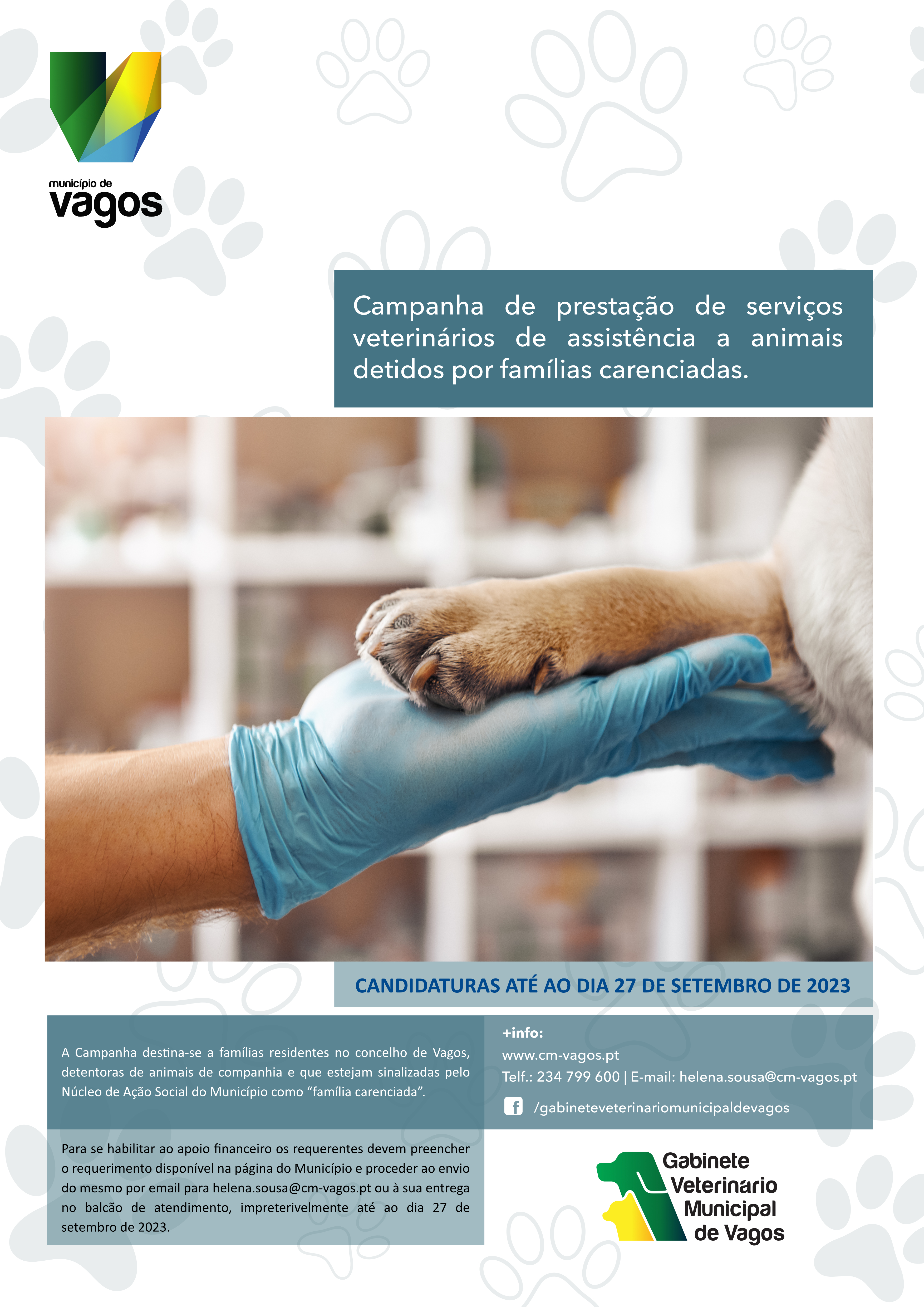 área de conteúdos (não partilhada)O Município de Vagos informa que está em curso uma campanha de apoio à prestação de serviços veterinários de assistência a animais domésticos detidos por famílias carenciadas residentes no concelho. Esta é uma iniciativa que decorre do aviso 6/2023 do ICNF.