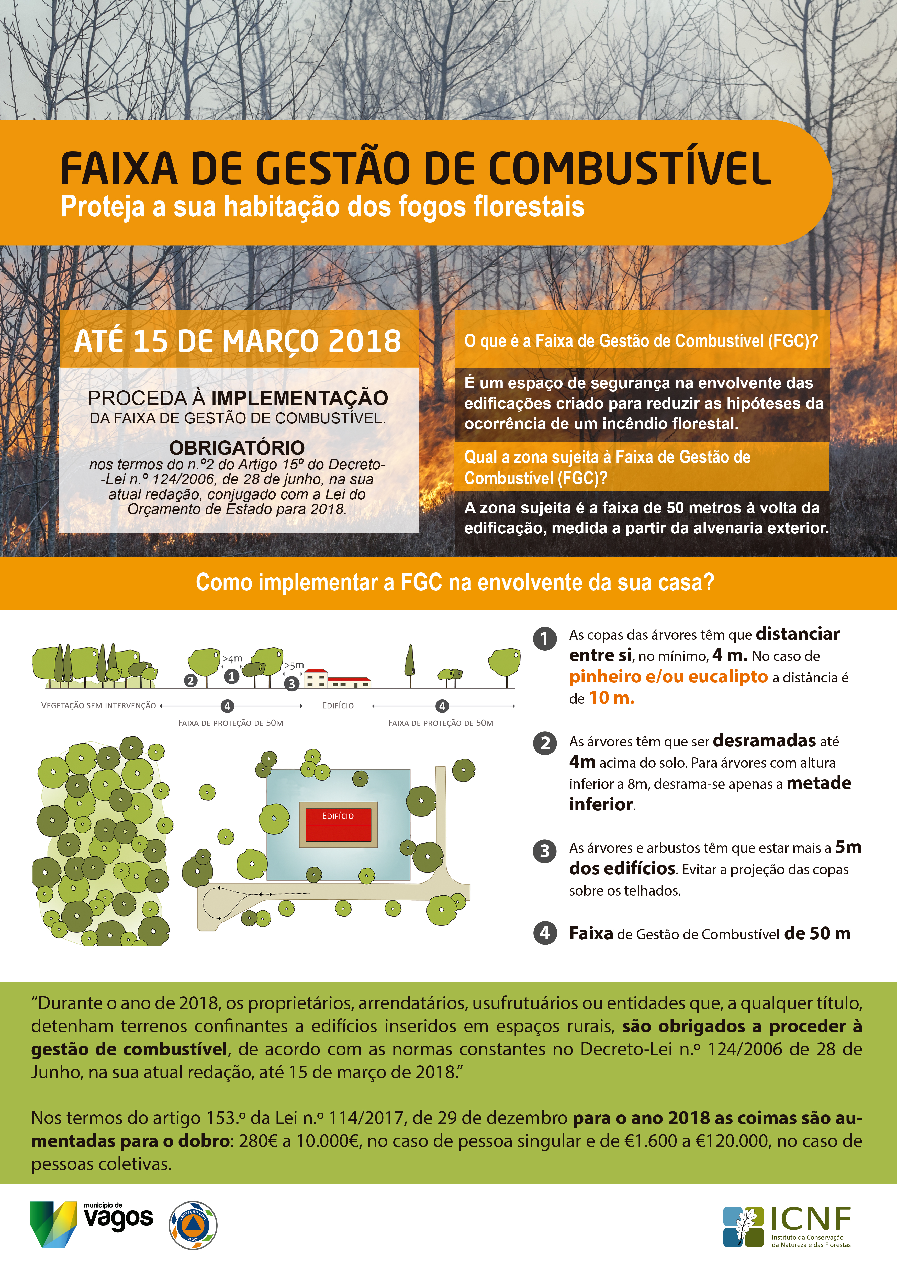 Com estas ações a Câmara Municipal de Vagos pretende alertar a população para a limpeza das Faixas de Gestão de Combustível. Deste modo e em articulação com as forças de segurança é possível evitar acidentes, como aqueles que ocorreram no passado dia 15 de outubro.