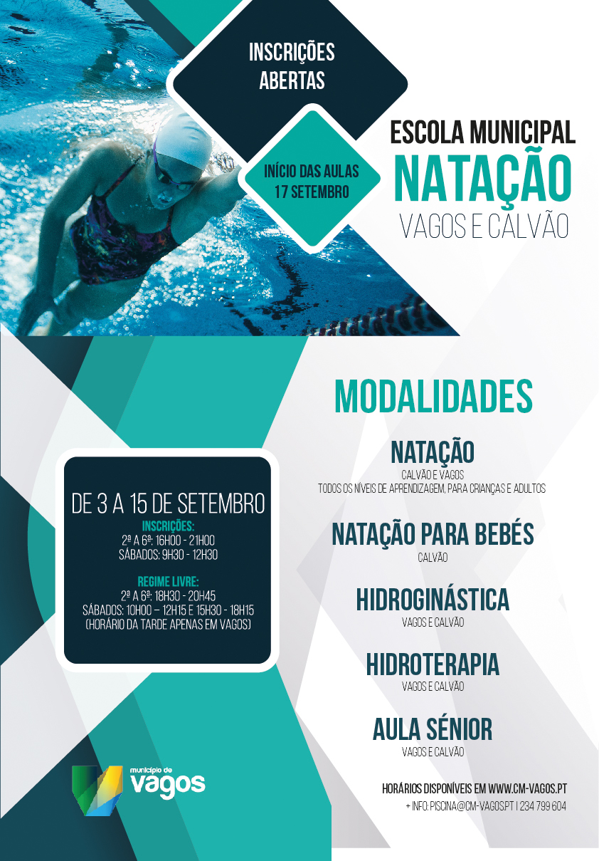 área de conteúdos (não partilhada)A nova época desportiva da Escola Municipal de Natação de Vagos terá início no dia 17 de setembro e as inscrições poderão ser realizadas a partir do dia 3 até 15 de setembro.
