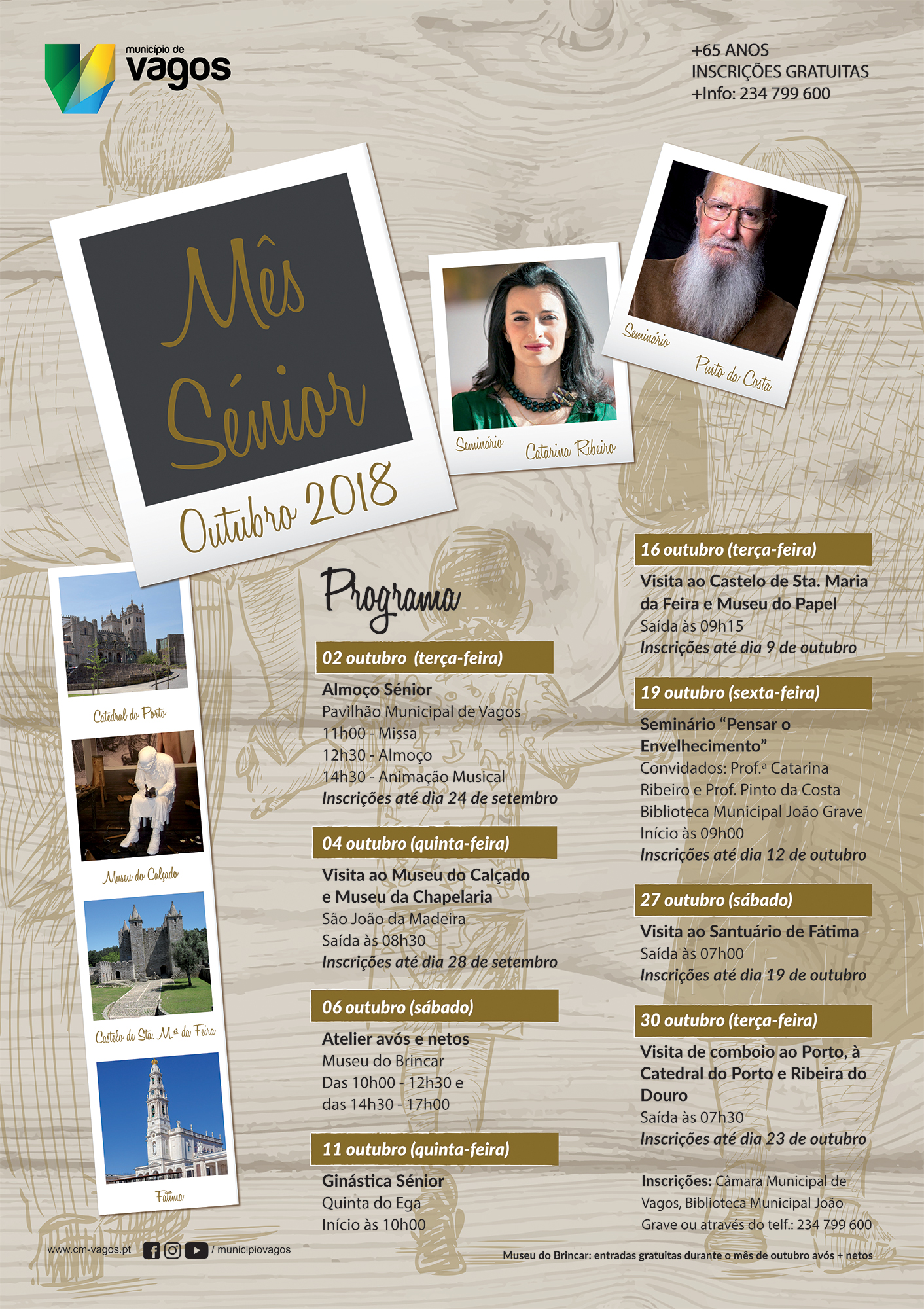 A Câmara Municipal de Vagos vem convidar, todos os seniores, a participar no Mês Sénior 2018. A participação nas atividades é gratuita, mas condicionada a inscrição prévia na Câmara Municipal, Biblioteca Municipal ou por telefone: 234 799 600.
