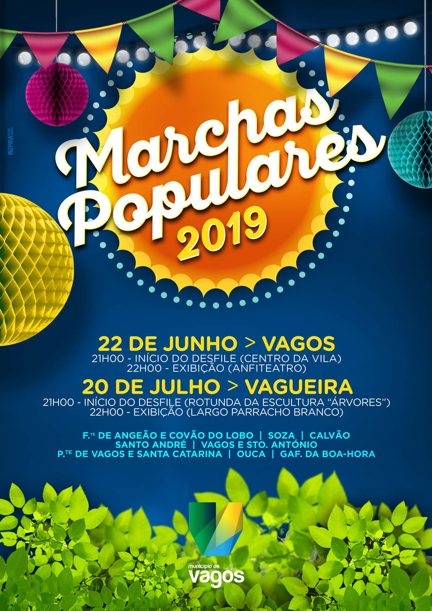 área de conteúdos (não partilhada)No próximo dia 22 de junho realiza-se, em Vagos, o tradicional desfile das Marchas Populares com início às 21h00, junto à Capela de Santo António, na saída de Vagos (sentido norte). As Marchas desfilarão pela estrada nacional (EN 109) até ao anfiteatro do centro da Vila, onde cada marcha fará a sua exibição.