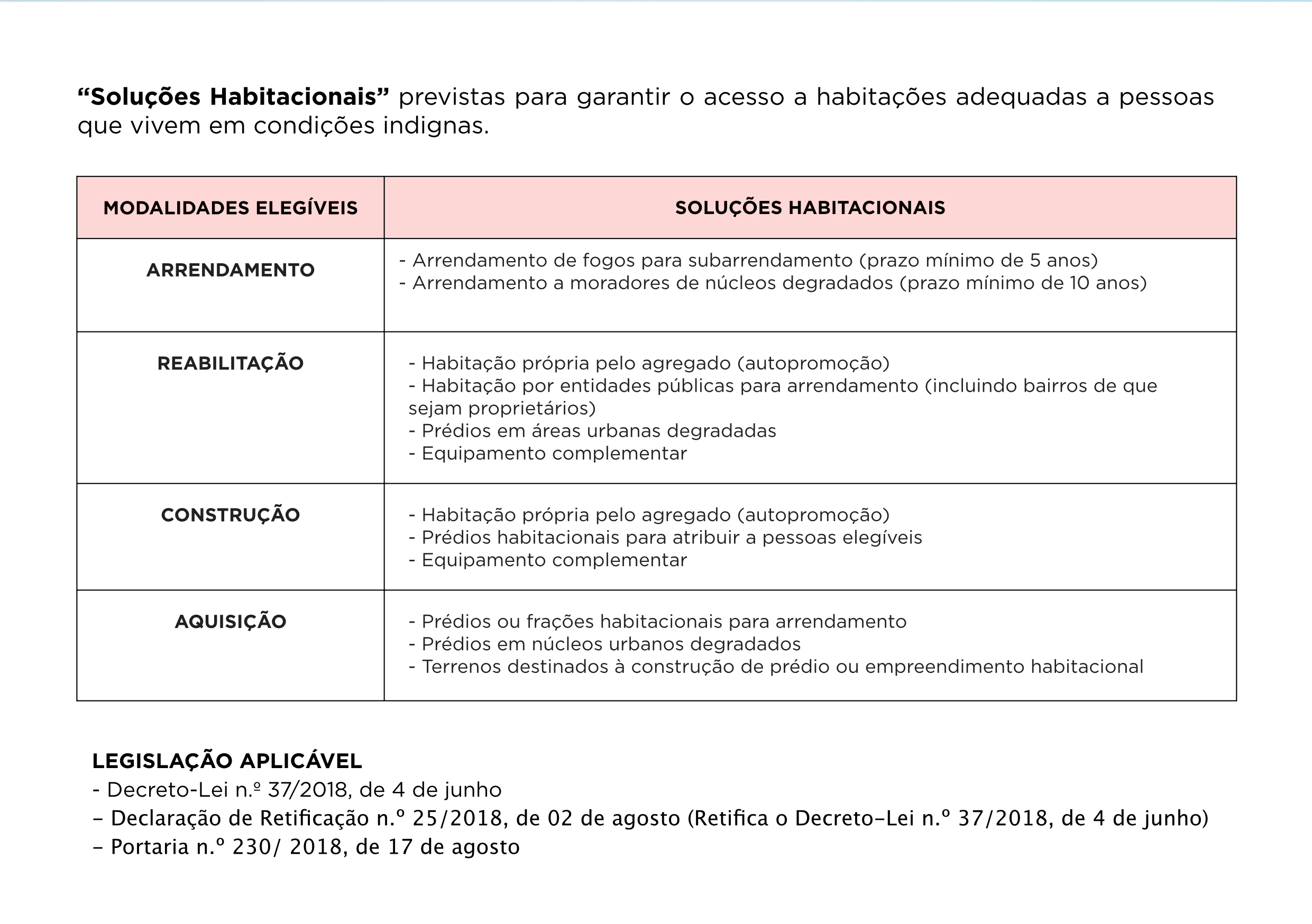 Este programa nacional consiste na concessão de apoio financeiro para a disponibilização de um leque diverso de soluções habitacionais a valores acessíveis ao universo dos destinatários, cobrindo as seguintes modalidades: o arrendamento, a reabilitação, a construção e a aquisição.