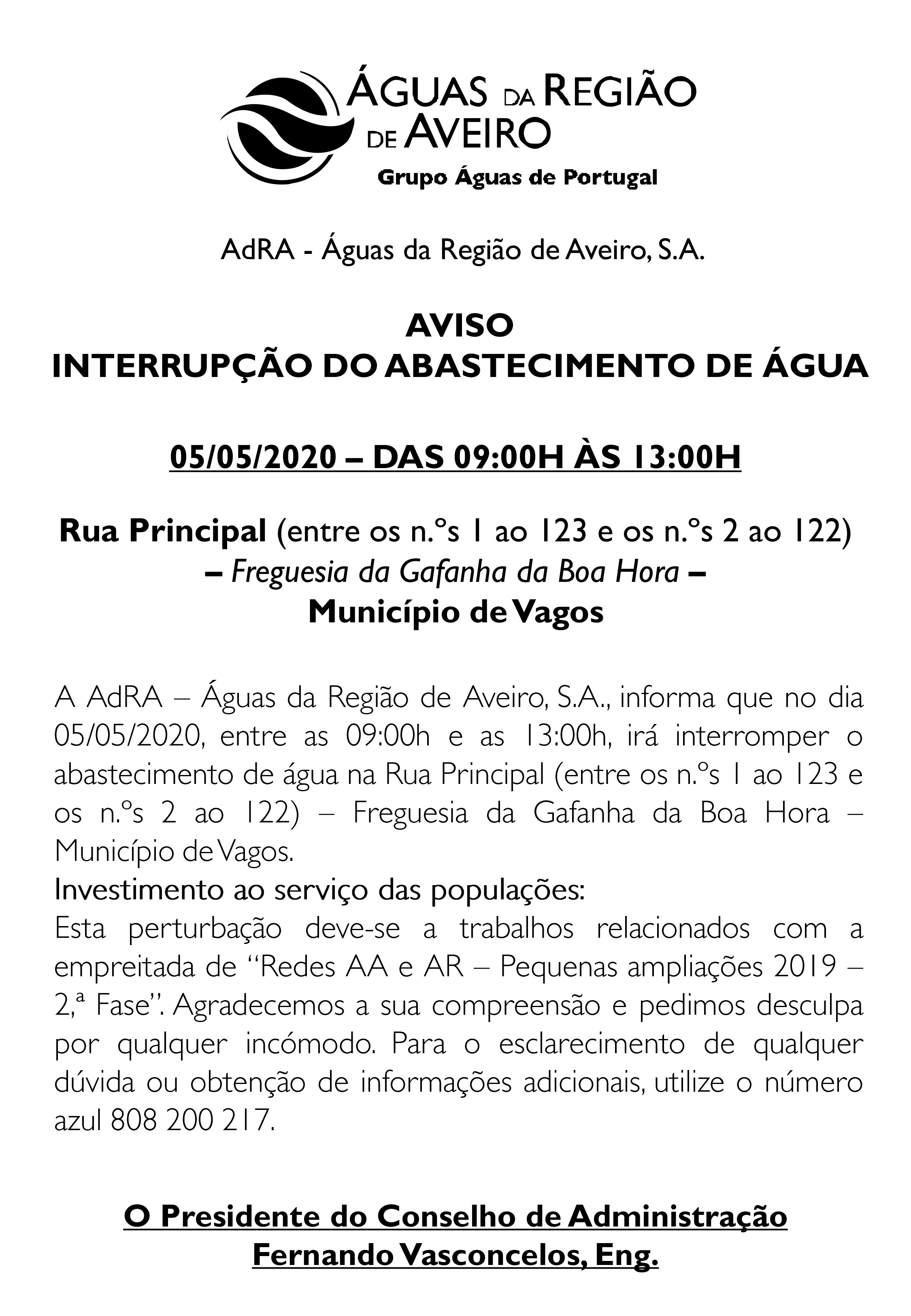 A Câmara Municipal de Vagos informa que a AdRA – Águas da Região de Aveiro, S.A, devido a trabalhos relacionados com a empreitada de “Redes AA e AR – Pequenas ampliações 2019 – 2ª fase”, irá interromper o fornecimento de água, no dia 05/05/2020, das 09h00 às 13h00, na Rua Principal (entre os n.ºs 1 ao 123 e os n.ºs 2 ao 122), na freguesia da Gafanha da Boa Hora.