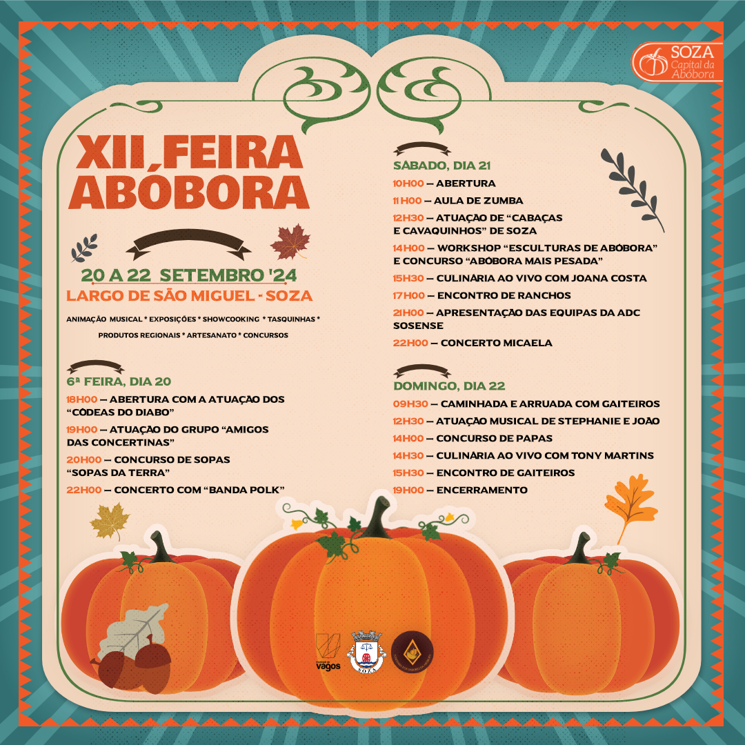 A Confraria dos Sabores da Abóbora, a Câmara Municipal de Vagos e a Junta de Freguesia de Soza promovem, no Largo de São Miguel, em Soza, a XII Feira da Abóbora.