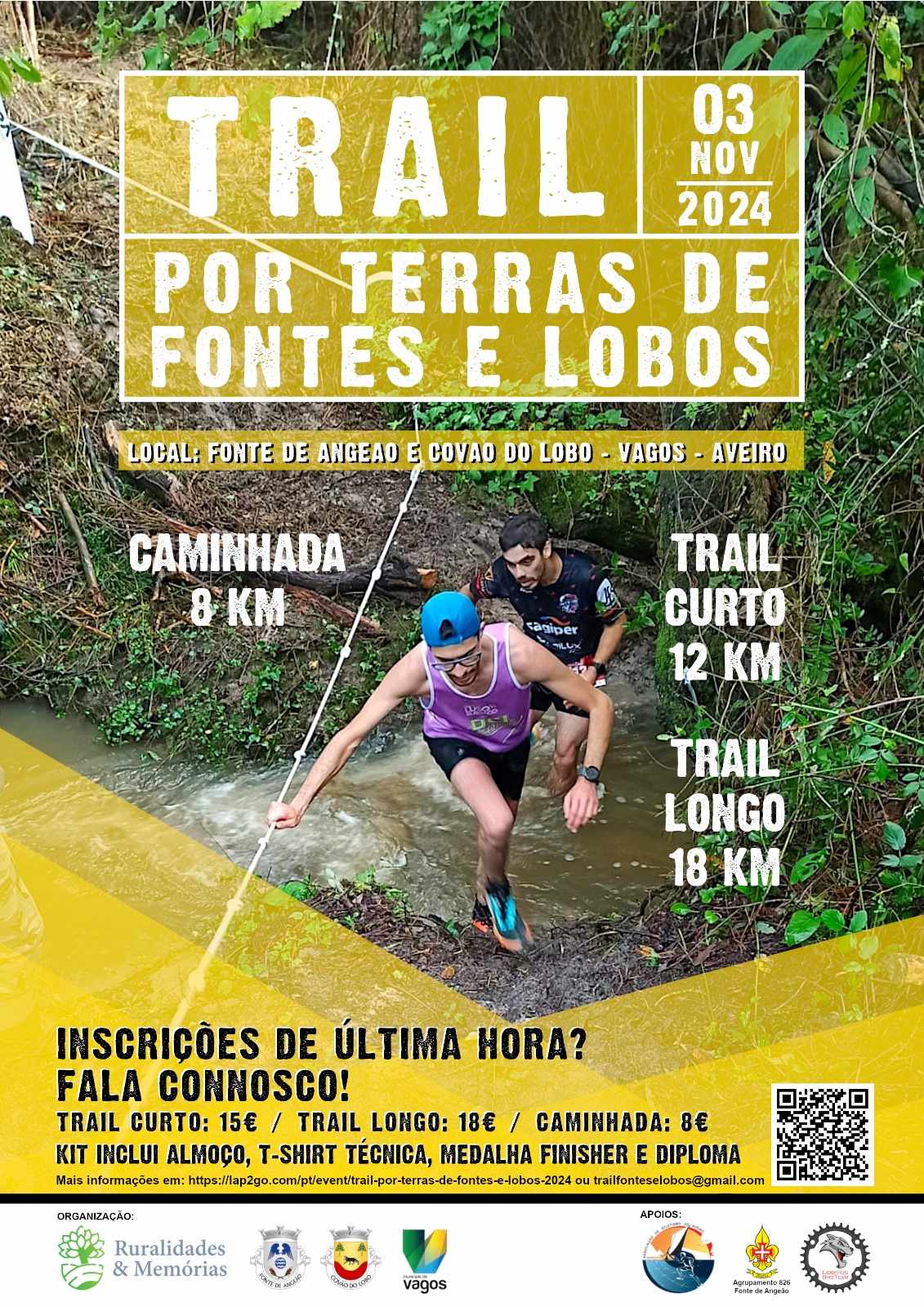 área de conteúdos (não partilhada)O trail "Por Terras de Fontes e Lobos" decorre no concelho de Vagos, no dia 3 de novembro, tendo início, pelas 9h30, junto ao Pavilhão Gimnodesportivo de Covão do Lobo, percorrendo trilhos da União de Freguesias de Fonte de Angeão e Covão do Lobo, apresentando aos participantes a beleza dos percursos e caminhos desta zona do concelho.