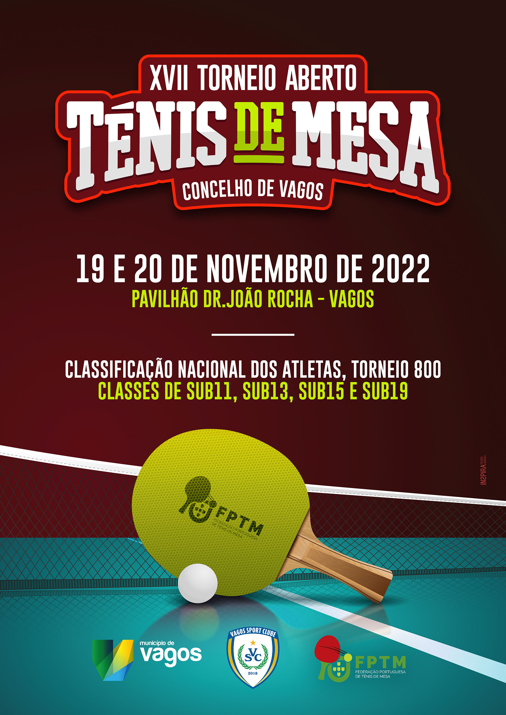 Realiza-se, nos dias 19 e 20 de novembro de 2022, no Pavilhão Desportivo Municipal Dr. João Rocha em Vagos, o XVII Torneio Aberto de Ténis de Mesa do Concelho de Vagos, com classificação Nacional dos atletas, Torneio 800, para as classes de Sub-11, Sub-13, Sub-15 e Sub-19.