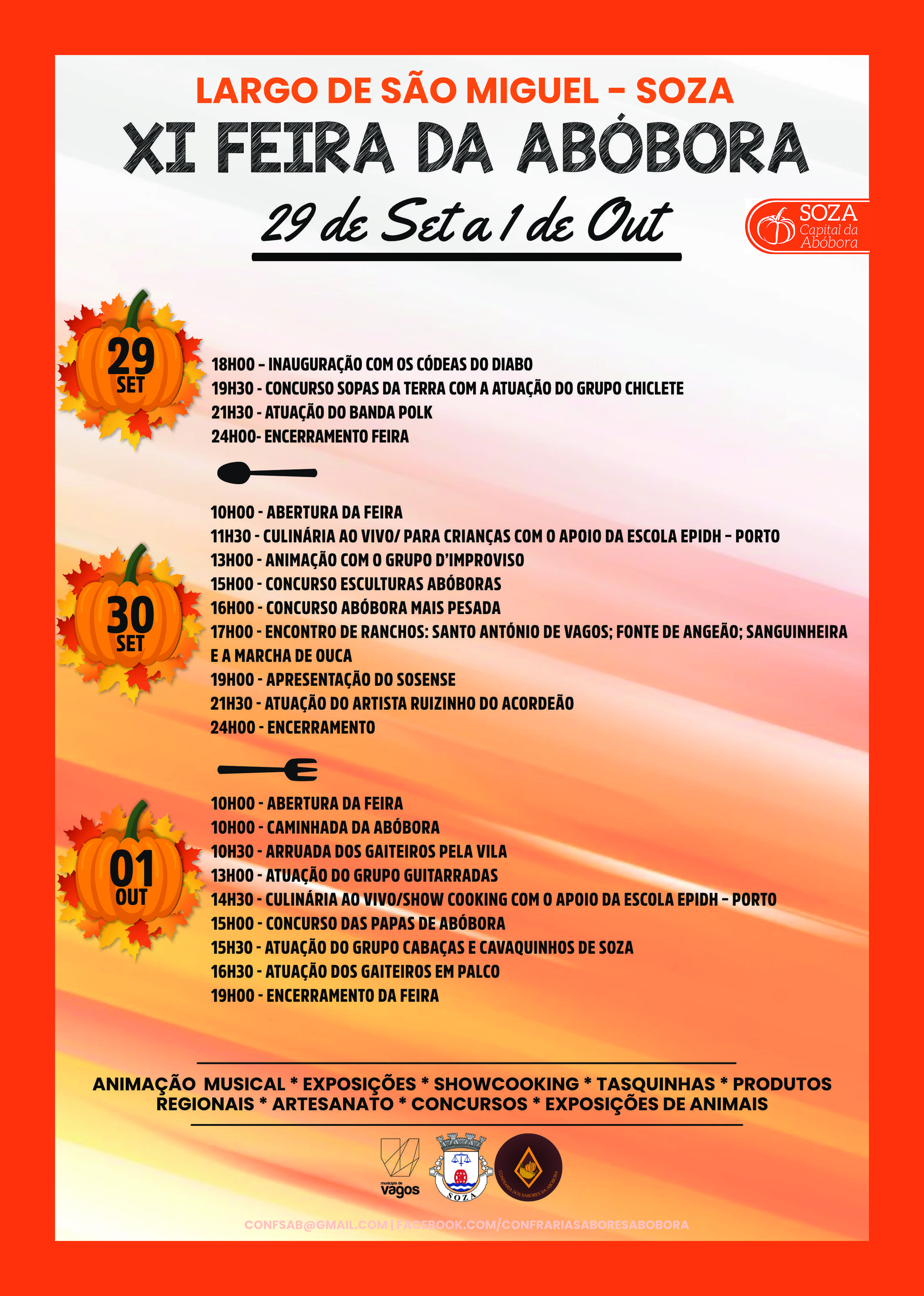 A Confraria dos Sabores da Abóbora, a Câmara Municipal de Vagos e a Junta de Freguesia de Soza promovem, no Largo de São Miguel, em Soza, a XI ª Feira da Abóbora.