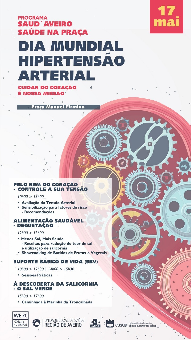 área de conteúdos (não partilhada)A Câmara Municipal de Aveiro em conjunto com os parceiros do Programa Municipal “SAUD’Aveiro – Saúde na Praça” irá assinalar o Dia Mundial da Hipertensão Arterial com a realização de várias atividades no próximo dia 17 de maio, sexta-feira na Praça do Mercado Manuel Firmino.