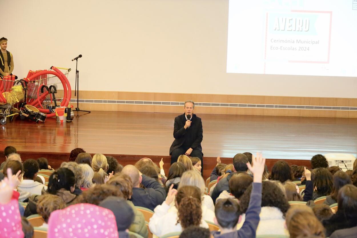 área de conteúdos (não partilhada)No passado dia 10 de dezembro, o Auditório do Parque de Exposições de Aveiro foi palco da Cerimónia Municipal Eco-Escolas 2024, onde foram distinguidos 35 estabelecimentos de ensino do Município de Aveiro com a Bandeira Verde. A sessão contou com a presença do Presidente da Câmara Municipal de Aveiro (CMA), José Ribau Esteves, do Vereador João Machado, e de uma plateia composta por alunos, professores, educadores e encarregados de educação.