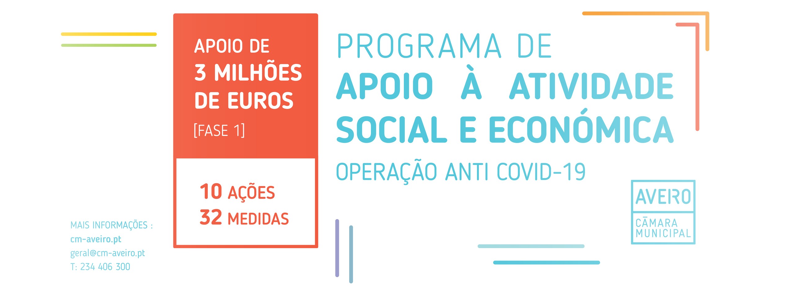 A Câmara Municipal de Aveiro (CMA) divulga publicamente o seu “Programa de Ação de Apoio à Atividade Social e Económica / Operação Anti Covid-19” (ver em anexo), que assume um valor de três milhões de euros, na sua primeira fase, distribuídos por 10 Áreas de atuação e com 32 Medidas de apoio.
