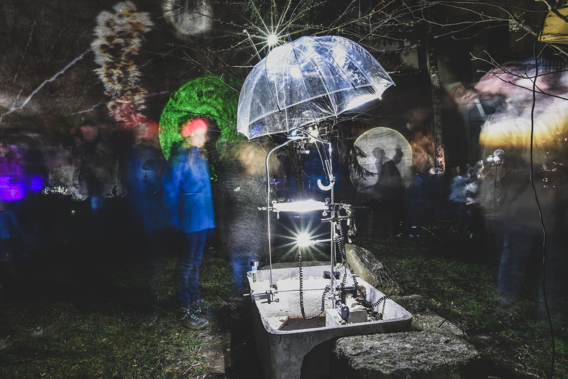 Feito com materiais reciclados o Octopus Garden cria um tempo meditativo através de luzes analógicas, sombras e movimentos entre o autónomo e o parcialmente acionado pelo público.