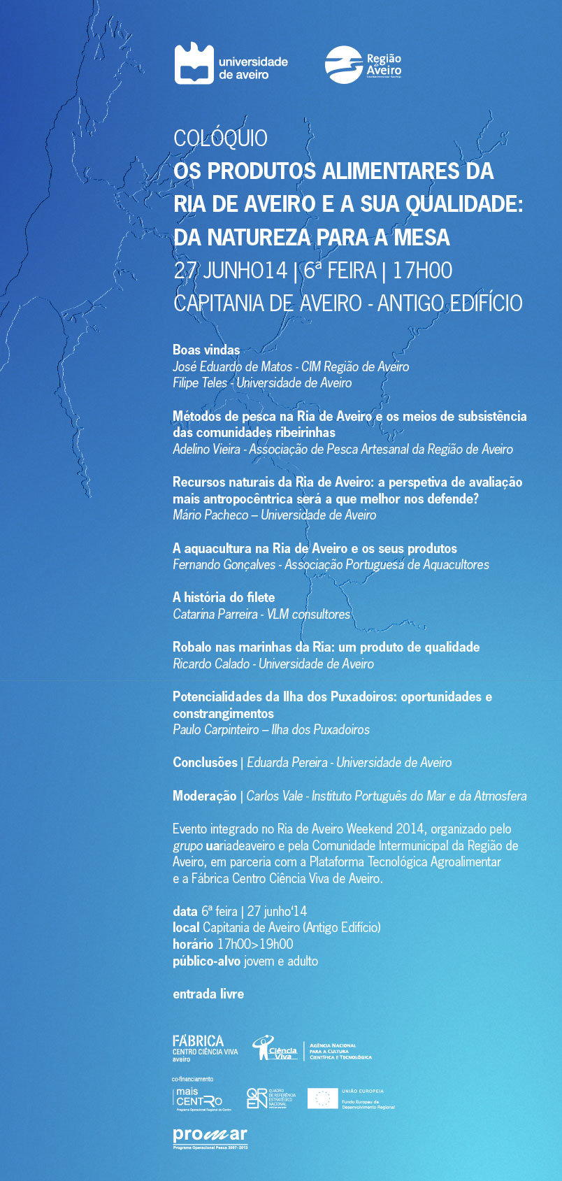 área de conteúdos (não partilhada)«Os produtos alimentares da Ria de Aveiro e a sua qualidade – Da Natureza para a mesa» é tema do colóquio a realizar dia 27 de junho, na Capitania de Aveiro, a partir das 17 horas.