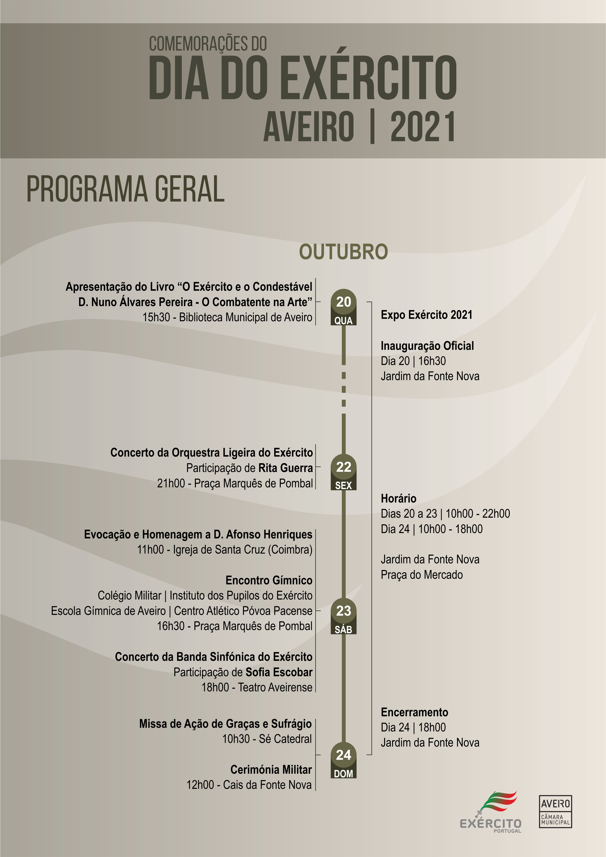 Esta semana, de 20 a 24 de outubro, quarta-feira a domingo, a Cidade de Aveiro recebe as Comemorações do dia do Exército. Uma organização do Exército Português em estreita colaboração e apoio da Câmara Municipal de Aveiro (CMA), que vai permitir aos Cidadãos terem acesso a um conjunto de iniciativas de natureza militar, cultural e recreativa.