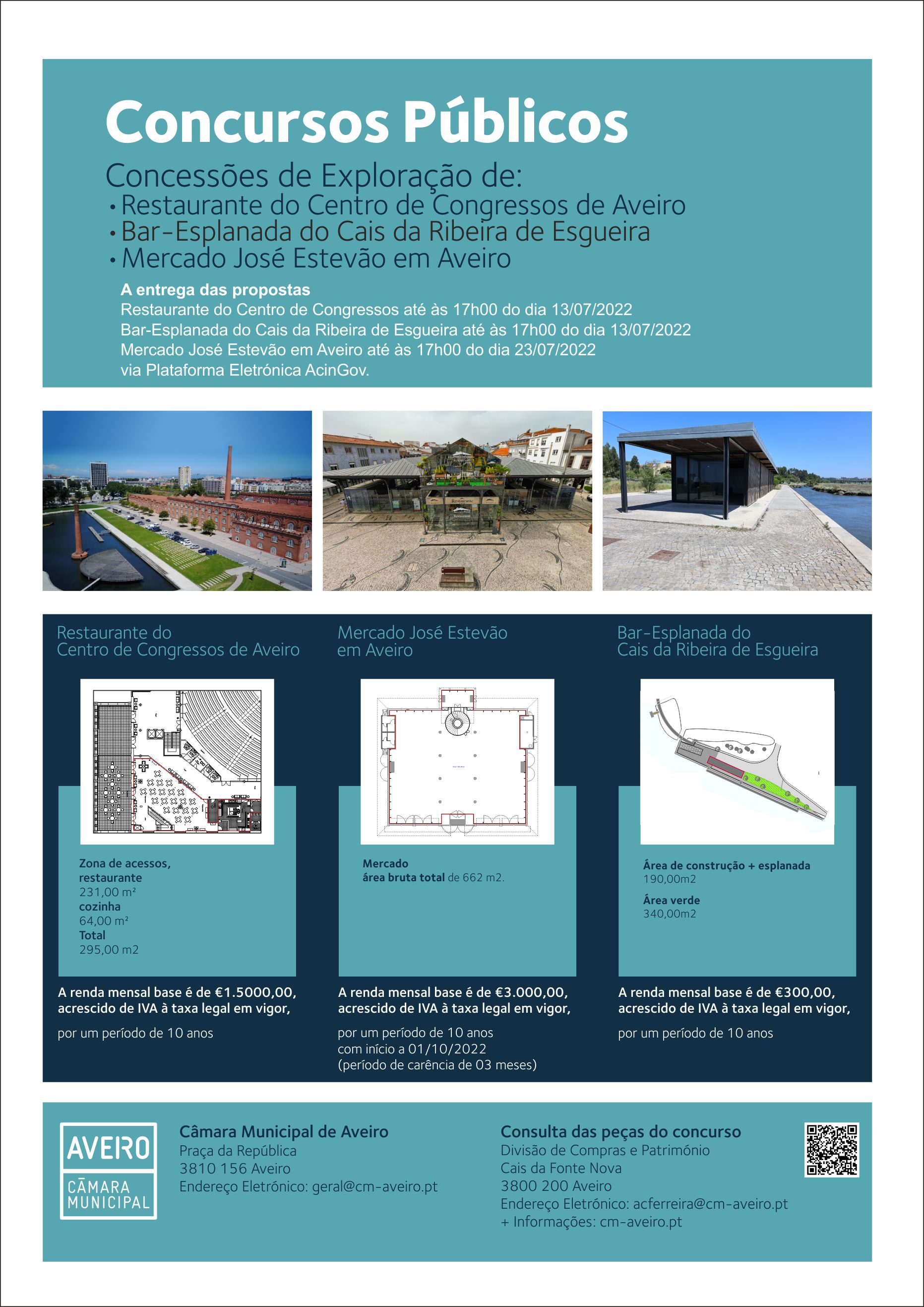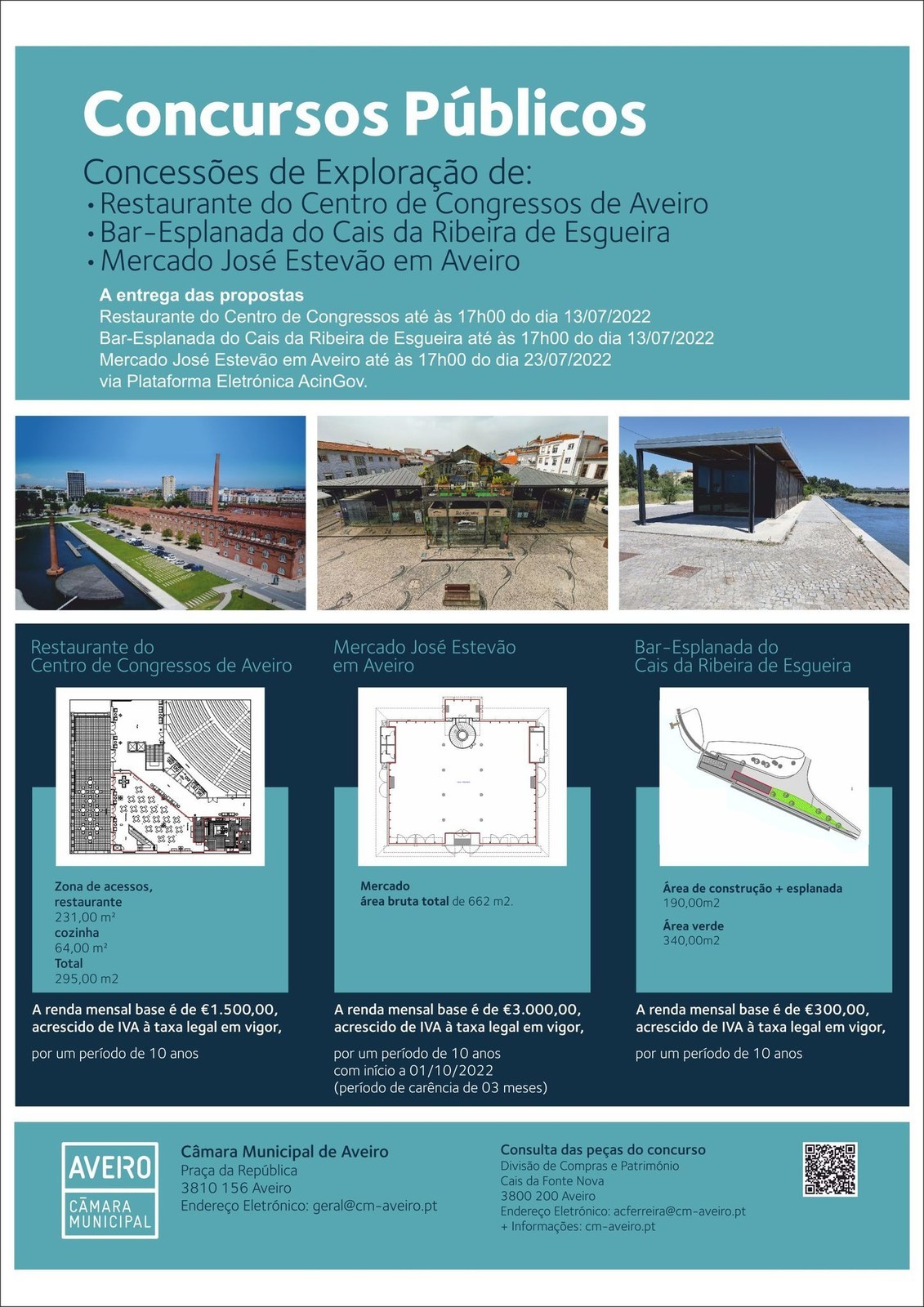 área de conteúdos (não partilhada)Estão lançados os concursos público para a concessão da gestão e exploração do Restaurante do Centro de Congressos de Aveiro, do Bar/esplanada do Cais da Ribeira de Esgueira e do Mercado José Estêvão (conhecido como Mercado do Peixe), com o seguinte calendário para apresentação das propostas (através da plataforma de contratação pública AcinGov):