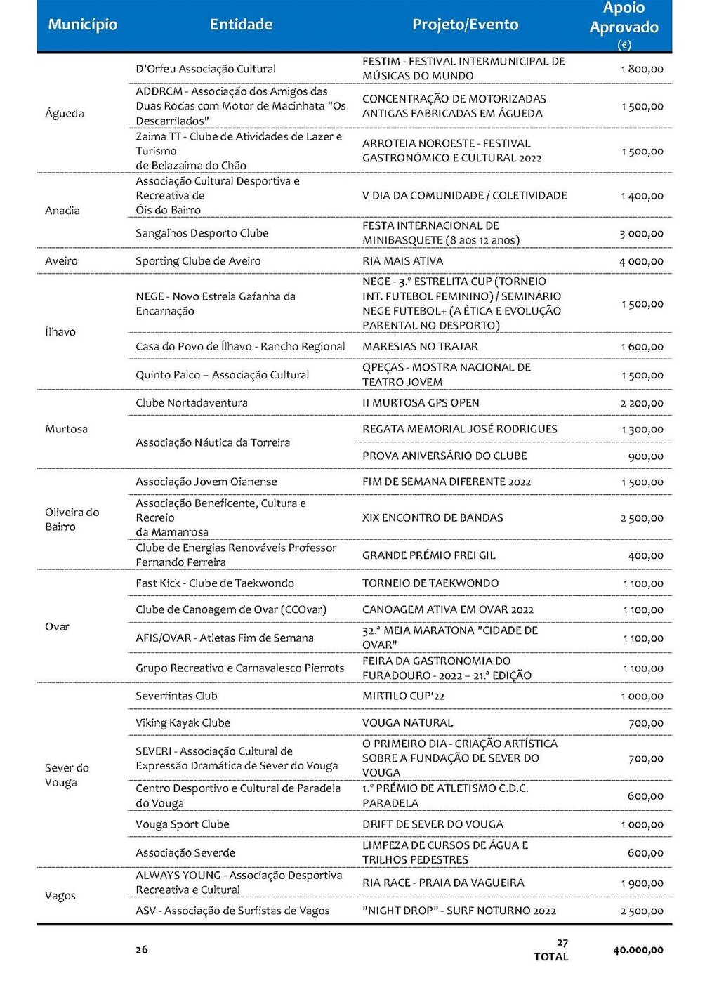 A CIRA segue a estratégia política assumida, de rigor e clarividência absoluta com os nossos concidadãos, divulgando a lista de apoios contratualizados para o apoio aos Projetos e Eventos da Região de Aveiro: